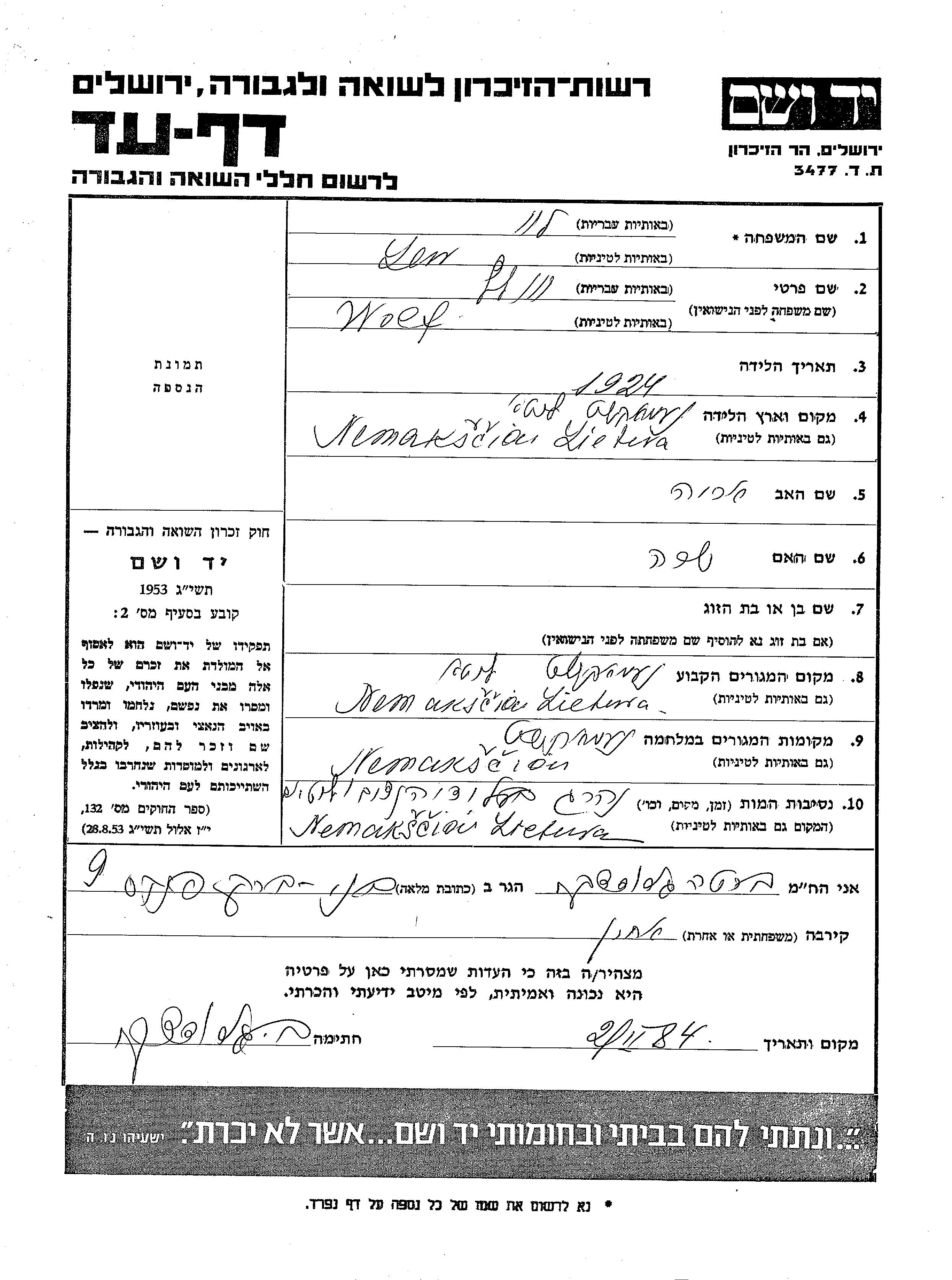 Лев Вольф 1924 Немакшчай, Литва Лист свидетельских показаний