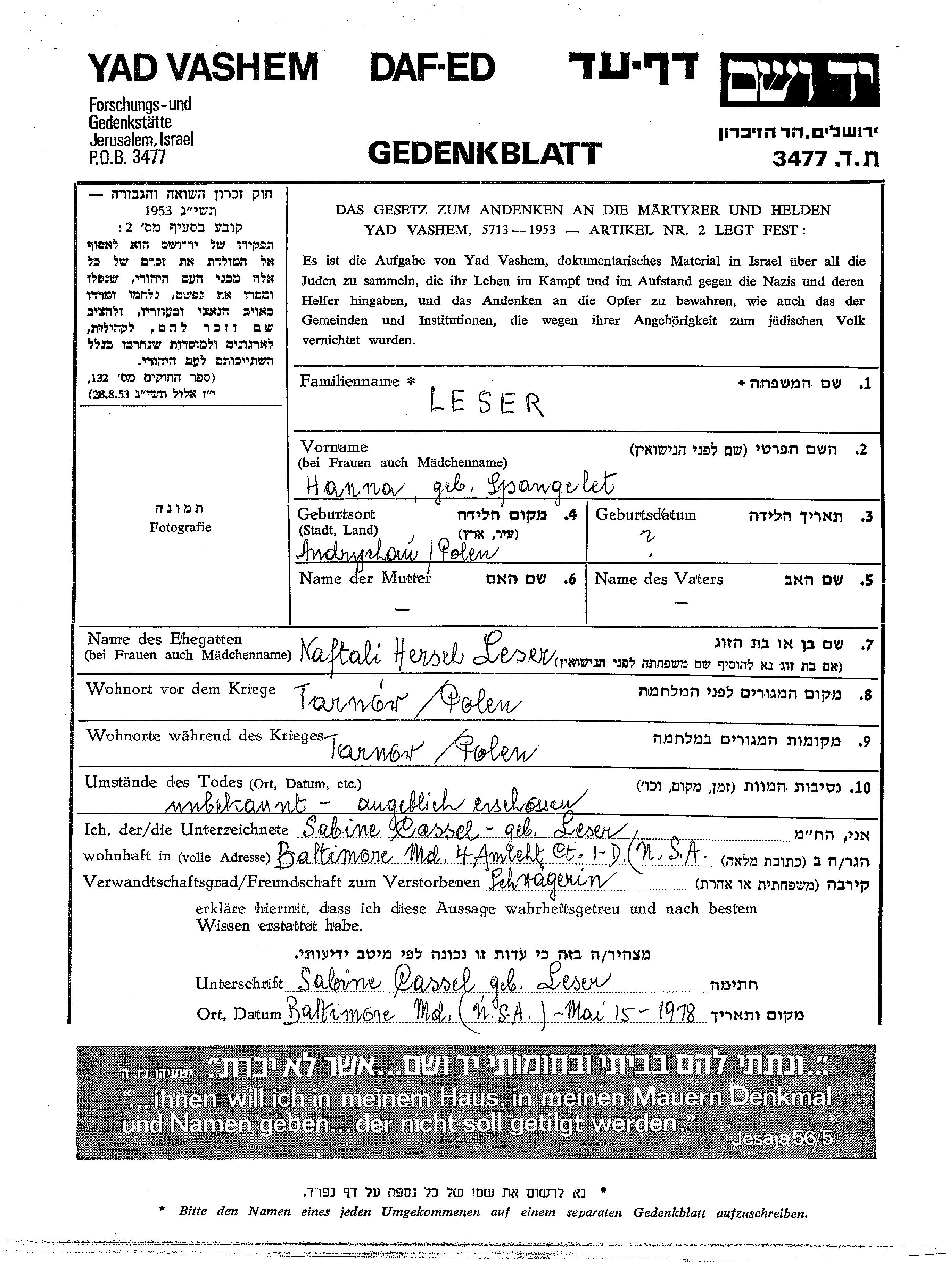 Ханна Лесер, девичья фамилия Спангелет, место рождения: Андрыхув, Польша. Женат / замужем. Место жительства до войны: Тарнув, Польша. Место во время войны: Тарнув, Польша.