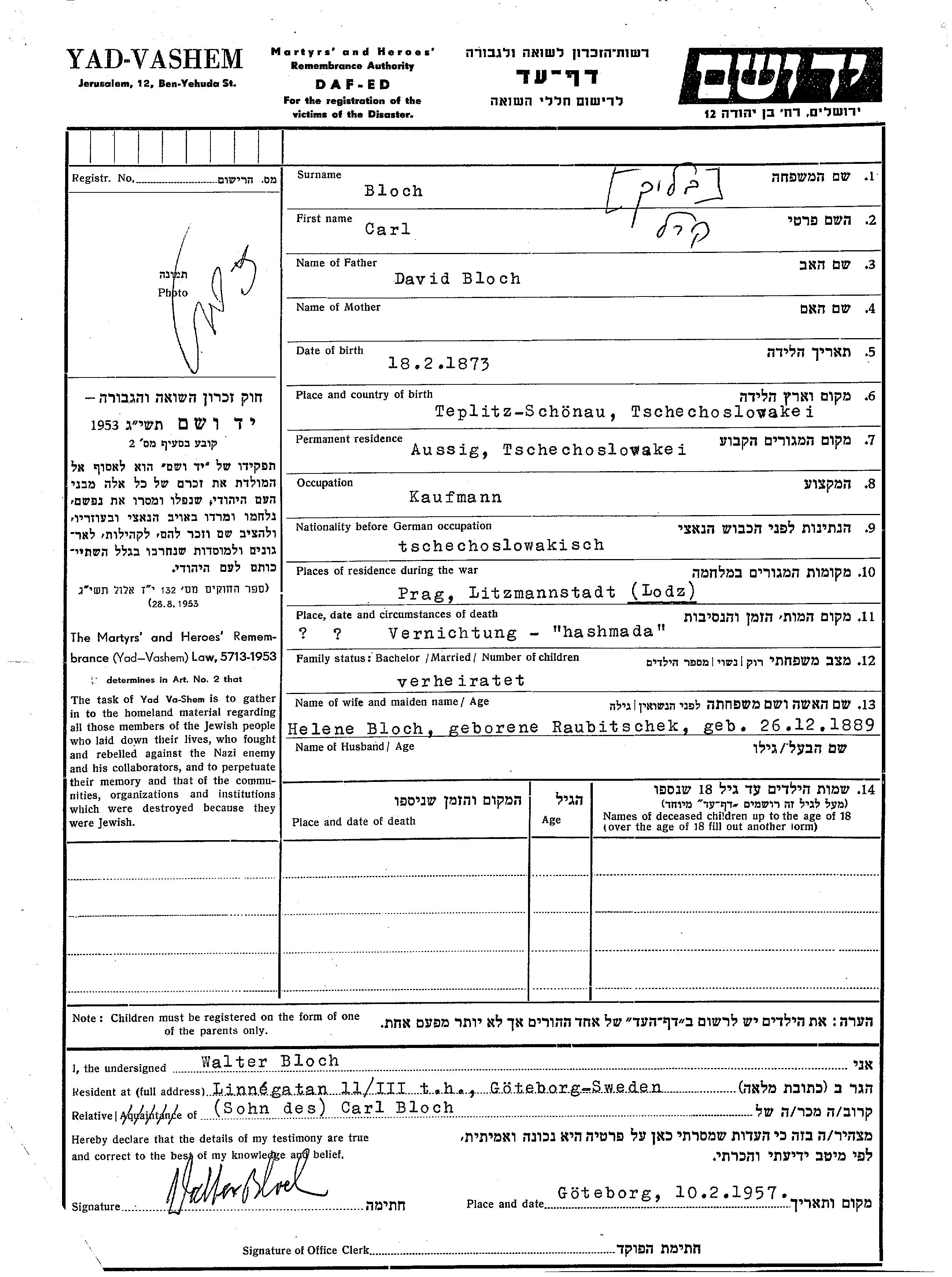 Карл Блох, место рождения: Теплиц-Шенау, Чехословакия. Отец: Давид. Торговец / торговка. Женат / замужем. Место жительства до войны: Лодзь, Польша. Место во время войны: Лодзь, Польша.