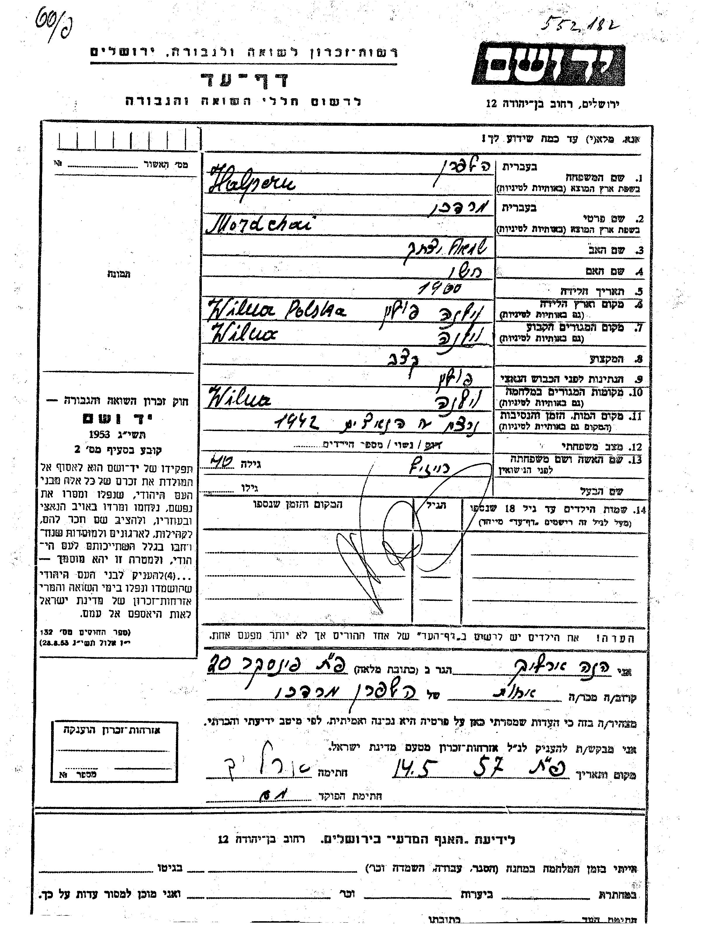 Мордхай Хальперн, место рождения: Вильно, Польша. Отец: Шмуэль Ицхак, mать:Хешу. Мясник. Женат / замужем. Место жительства до войны: Вильно, Польша. Место во время войны: Вильно, Польша.