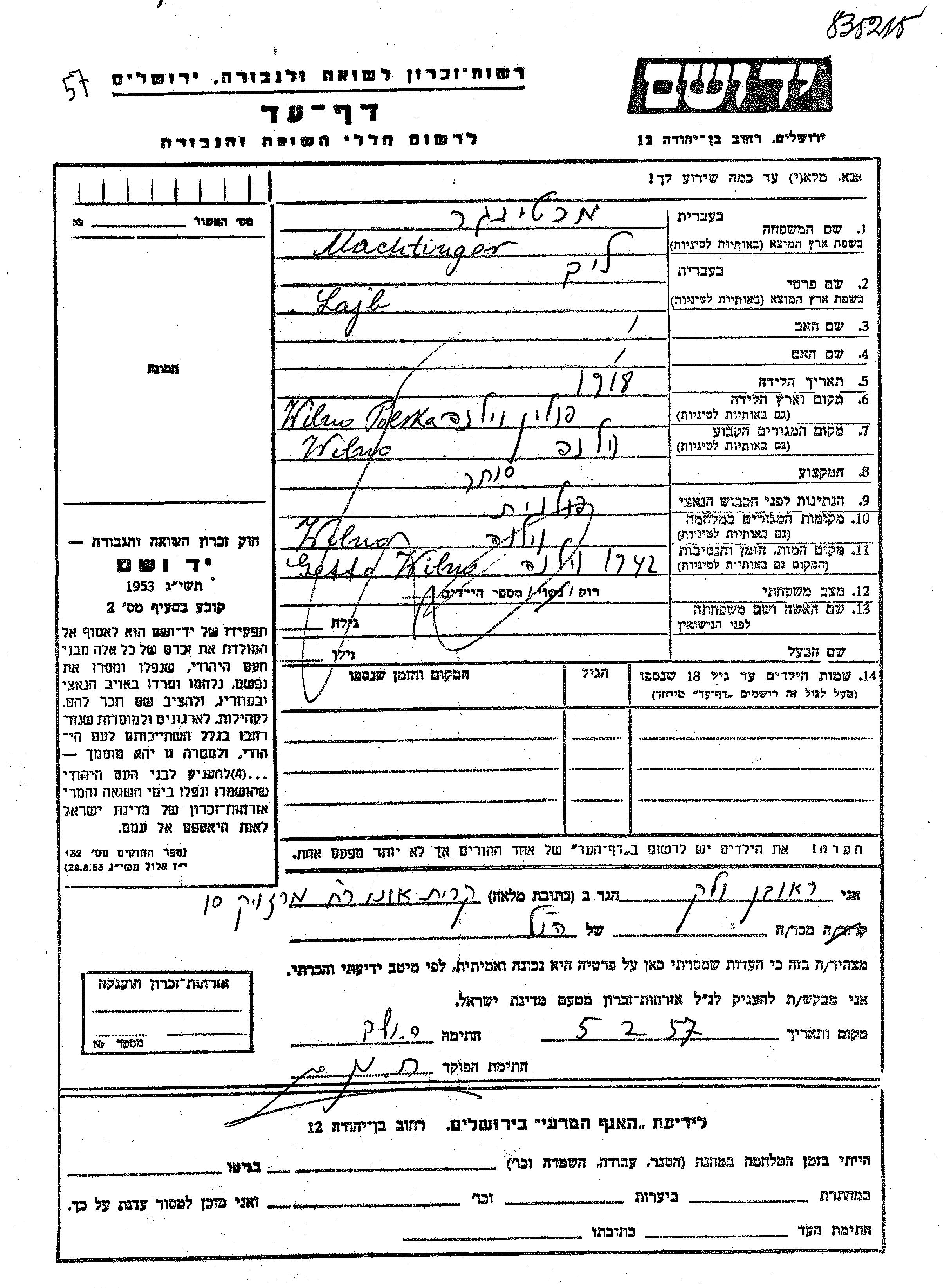 Лайб Махтингер, место рождения: Вильно, Польша. Торговец / торговка. Холост / не замужем. Место жительства до войны: Вильно, Польша. Место во время войны: Вильно, Польша.