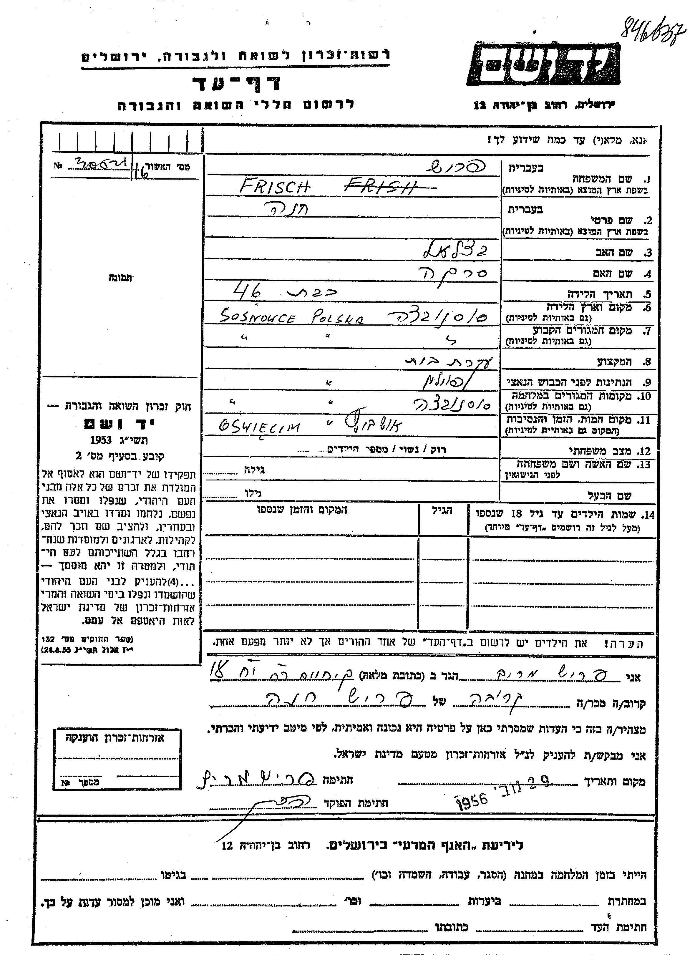 Хана Фриш, место рождения: Сосновце, Польша. Отец: Бецалель, mать:Серка. Домохозяйка. Место жительства до войны: Сосновец, Польша. Место во время войны: Сосновец, Польша.