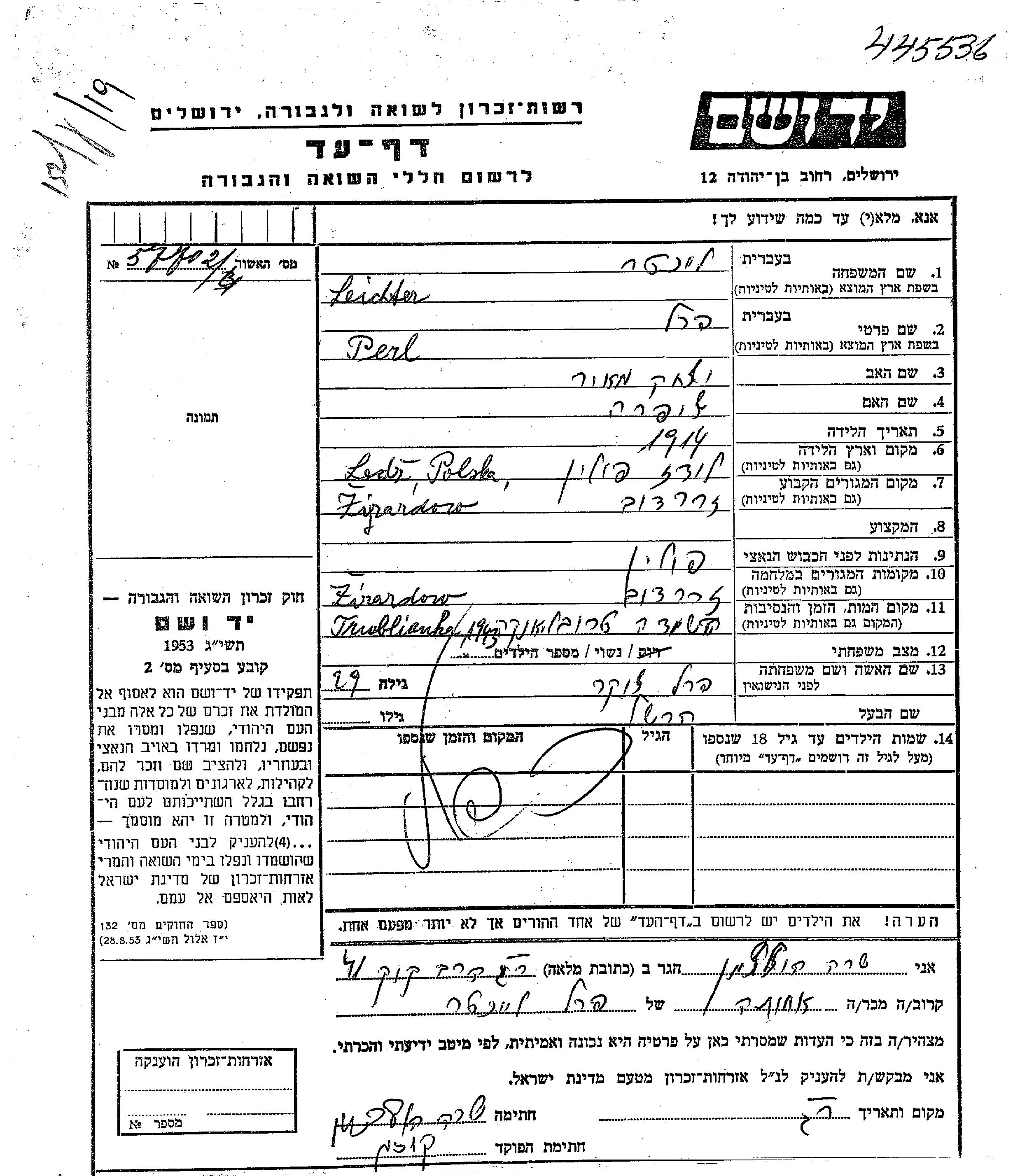 Перл Лейхтер Лихтер, девичья фамилия Цукер, место рождения: Лодзь, Польша. Отец: Ицхак Меир, mать:Шифра. Женат / замужем. Место жительства до войны: Жирардов, Польша. Место во время войны: Жирардов, Польша.