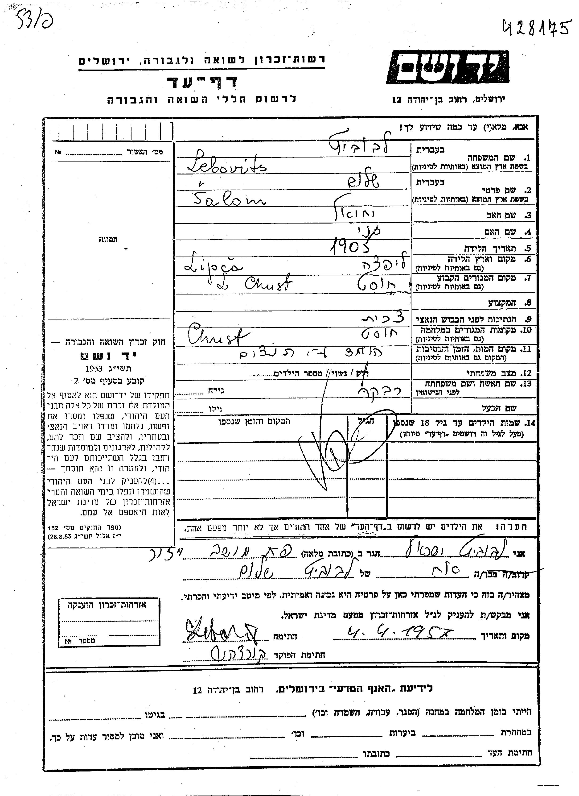 Салом Лебовиц, место рождения: Липча, Чехословакия. Отец: Иехиэль, mать:Сани. Женат / замужем. Место жительства до войны: Хуст, Чехословакия. Место во время войны: Хуст, Чехословакия.