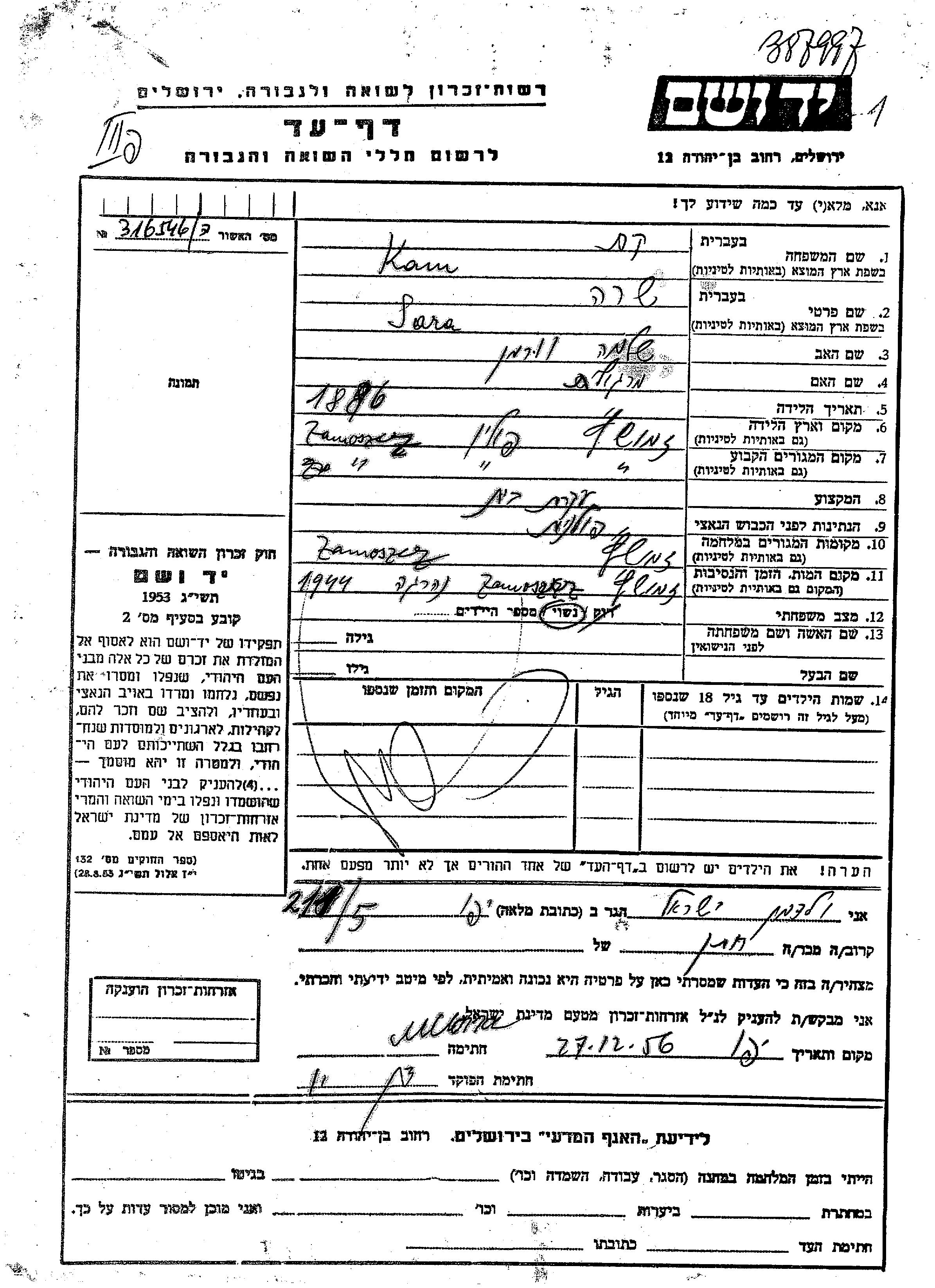 Сара Кам, девичья фамилия Ворман, место рождения: Замосць, Польша. Отец: Шломо, mать:Марголит. Домохозяйка. Женат / замужем. Место жительства до войны: Замосць, Польша. Место во время войны: Замосць, Польша.