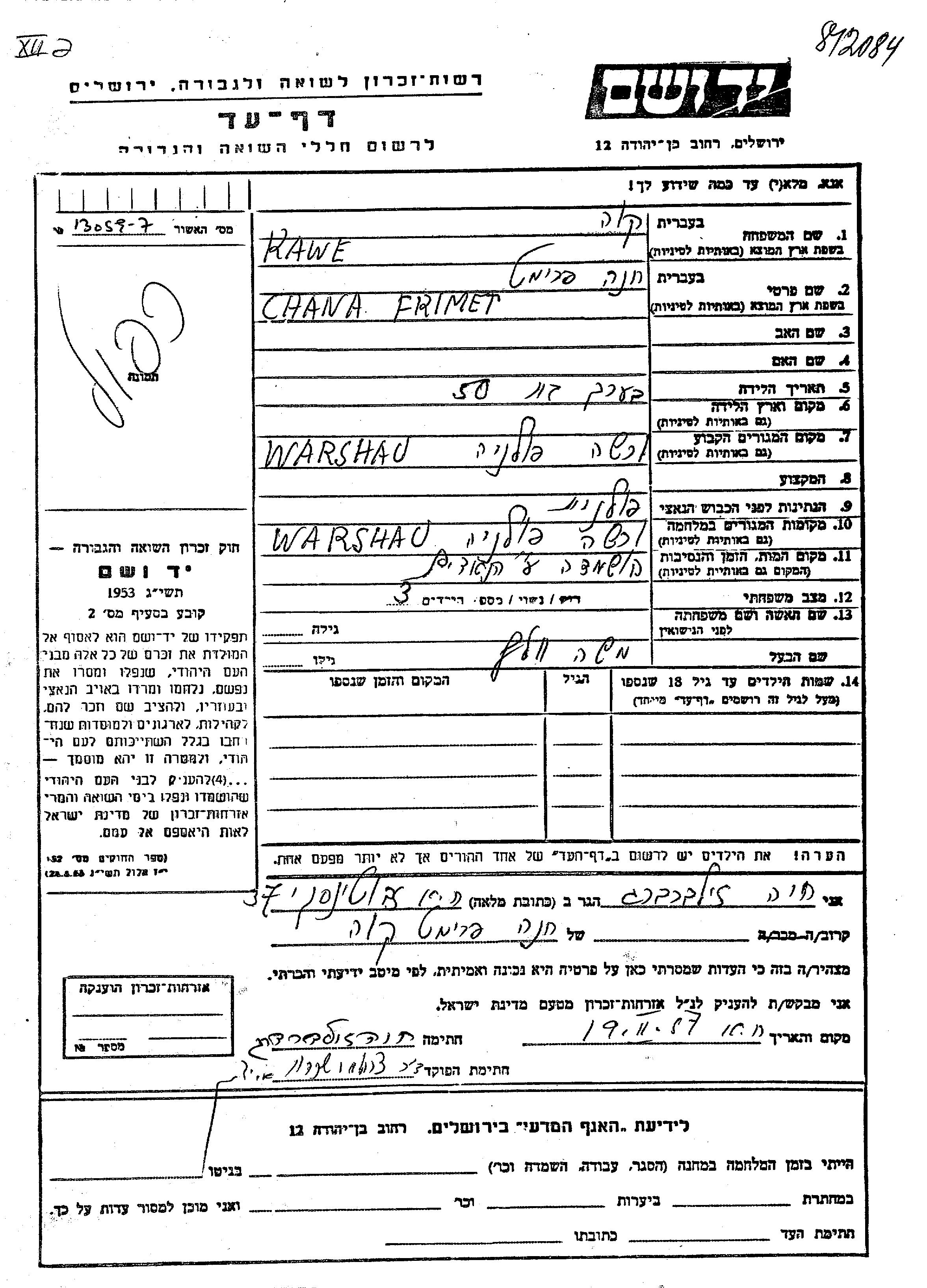 Хана Фримет Каве. Женат / замужем. Место жительства до войны: Варшава, Польша. Место во время войны: Варшава, Польша.