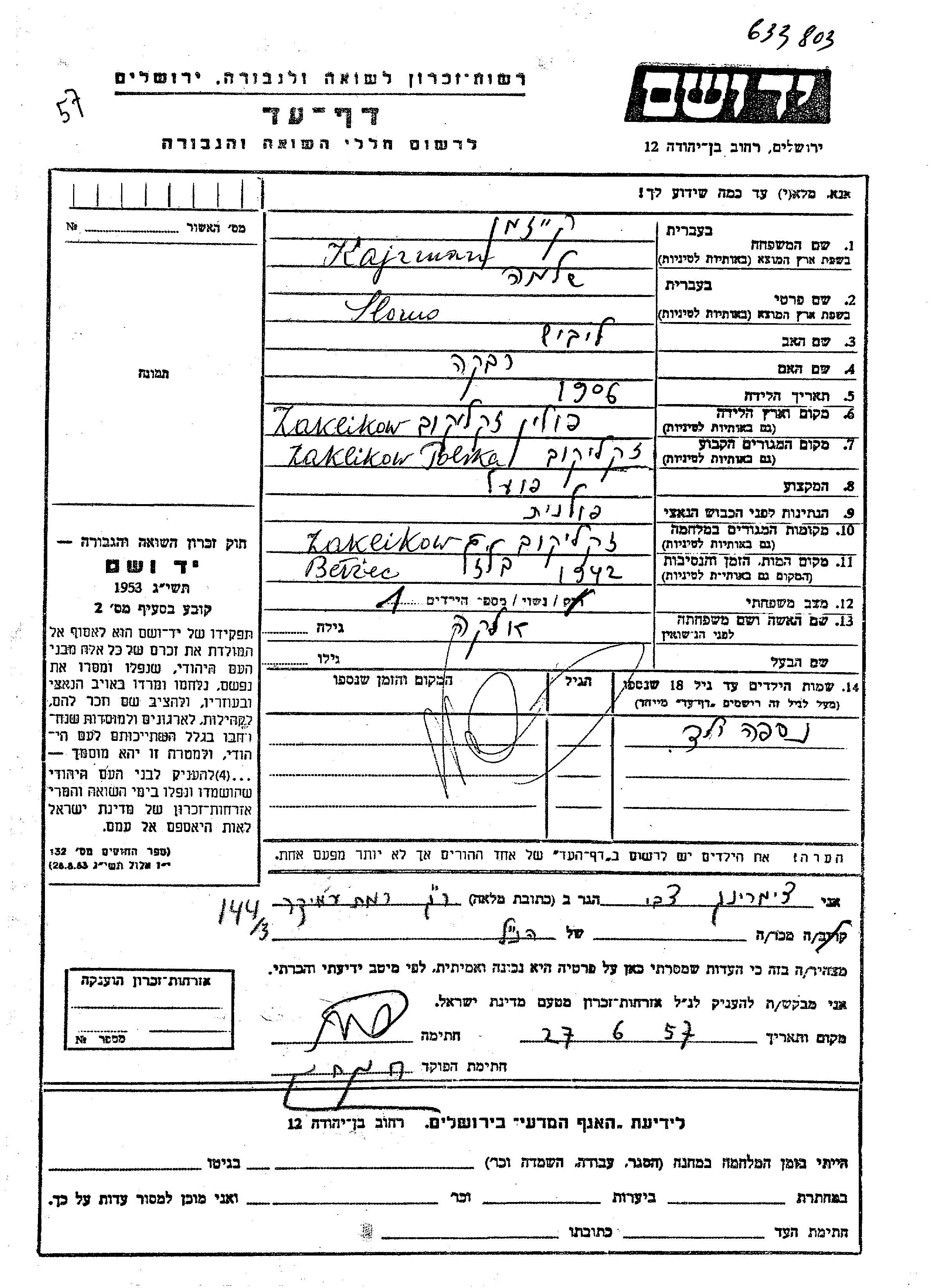 Кайзман Шломо 1906 Закликув, Польша Лист свидетельских показаний