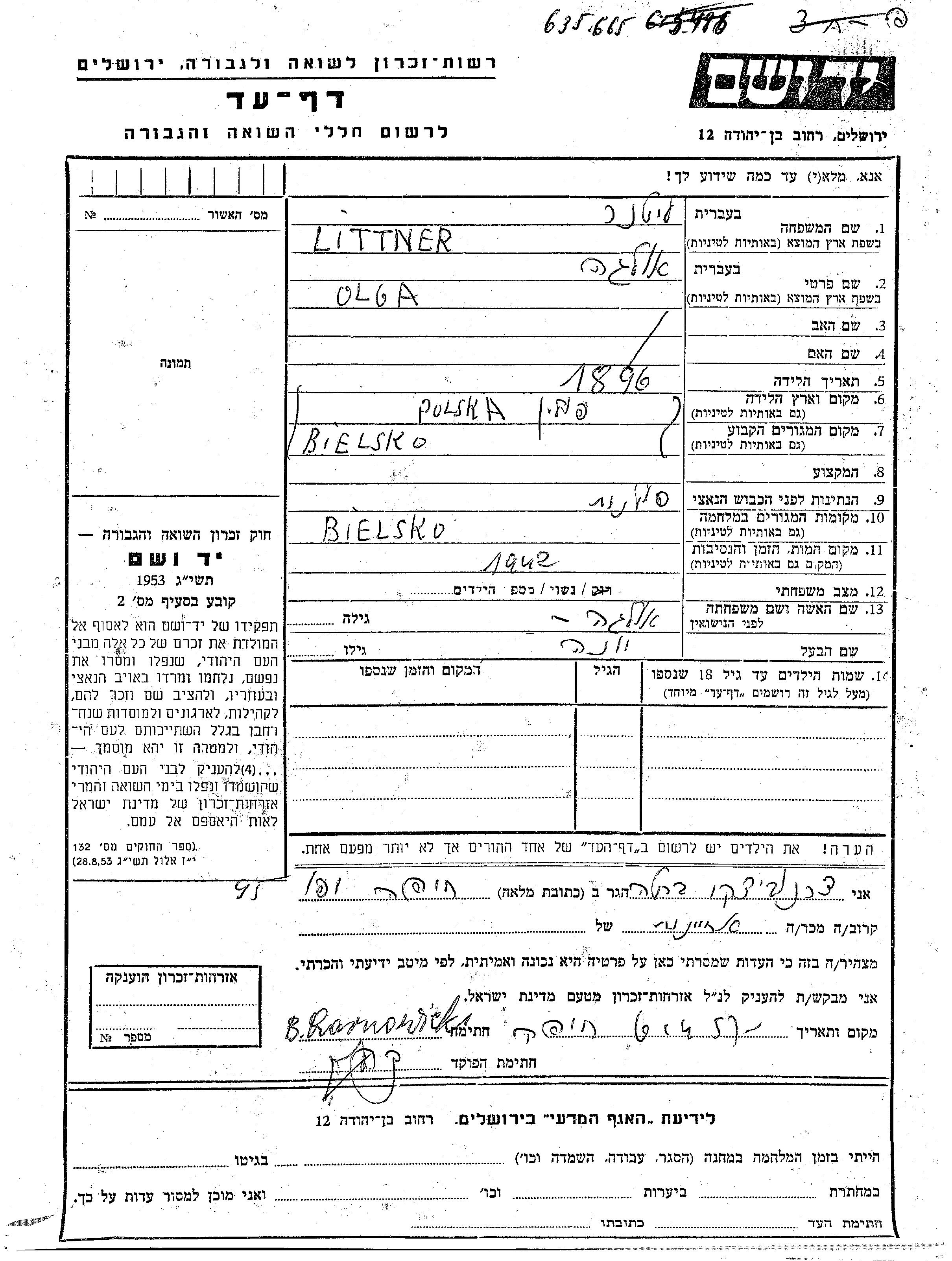 Ольга Литтнер, место рождения: Бельско, Польша. Женат / замужем. Место жительства до войны: Бельско, Польша. Место во время войны: Бельско, Польша.