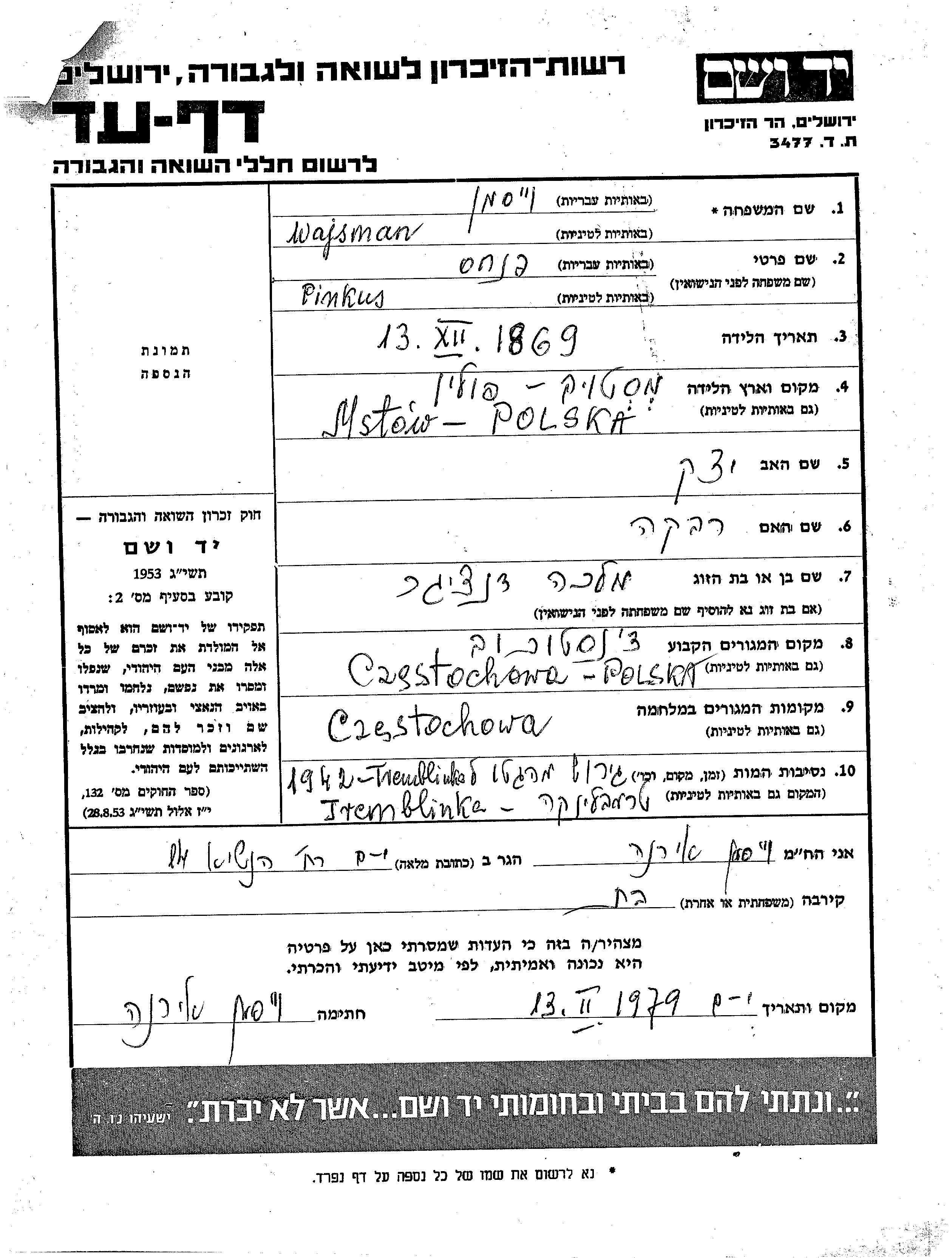 Пинкус Вайсман, место рождения: Мстов, Польша. Отец: Яцек, mать:Ривка. Место жительства до войны: Ченстохова, Польша. Место во время войны: Ченстохова, Польша.
