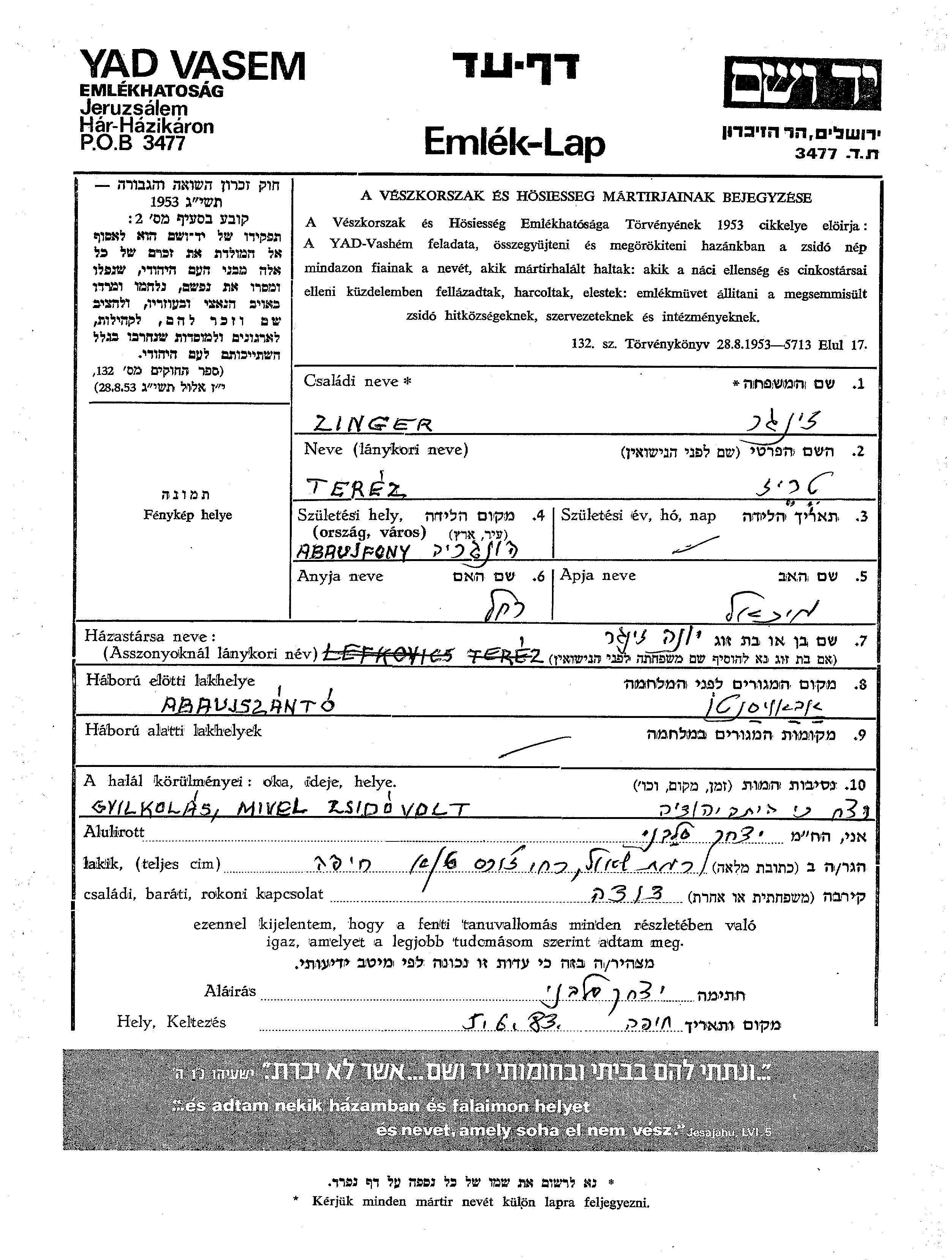 Терез Зингер, девичья фамилия Лефкович, место рождения: Абауйфалу, Венгрия. Отец: Михаэль, mать:Рахель. Женат / замужем. Место жительства до войны: Абауйсанто, Венгрия.