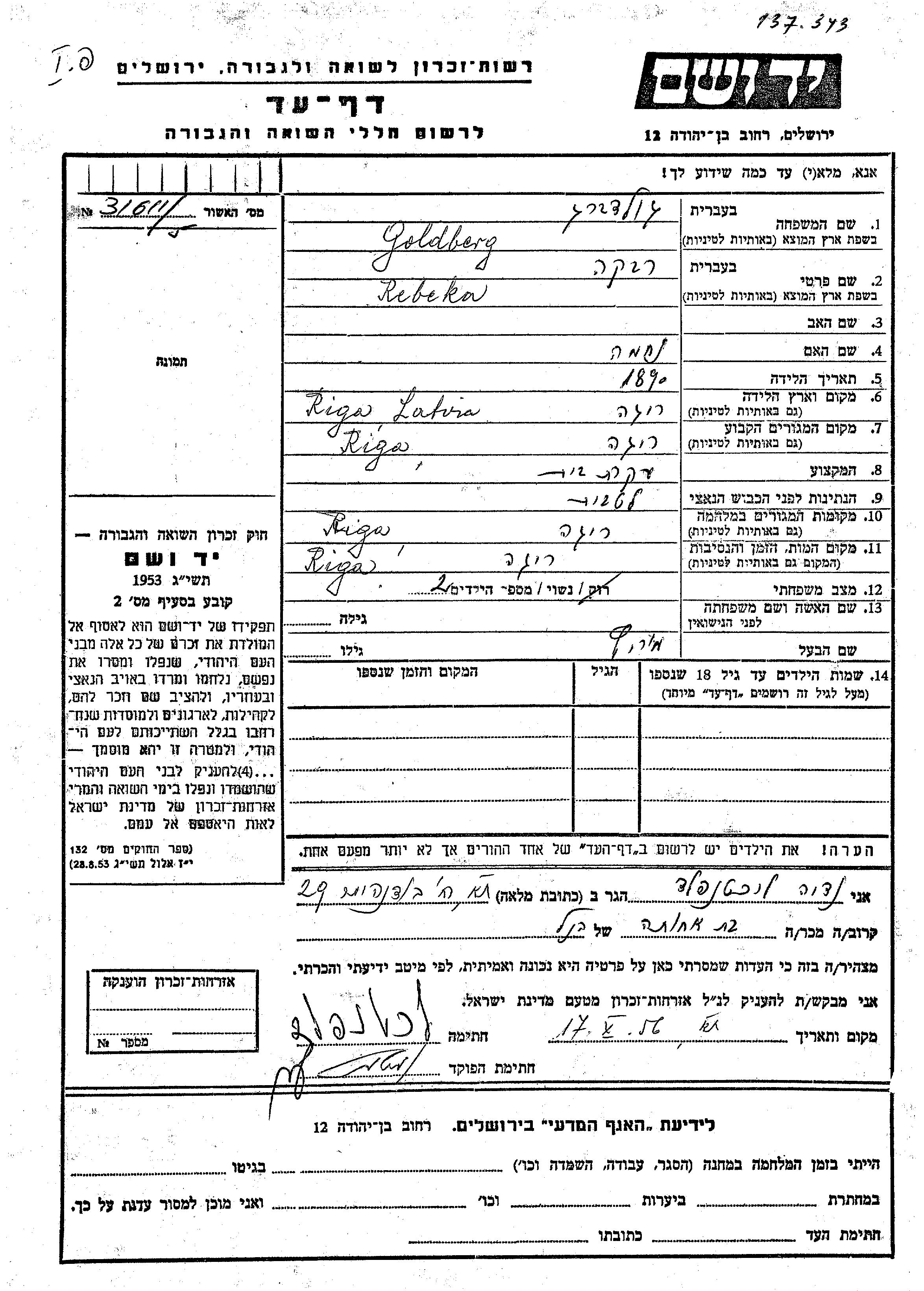 Ребека Гольдберг, место рождения: Рига, Латвия.Mать:Нехама. Домохозяйка. Женат / замужем. Место жительства до войны: Рига, Латвия. Место во время войны: Рига, Латвия.