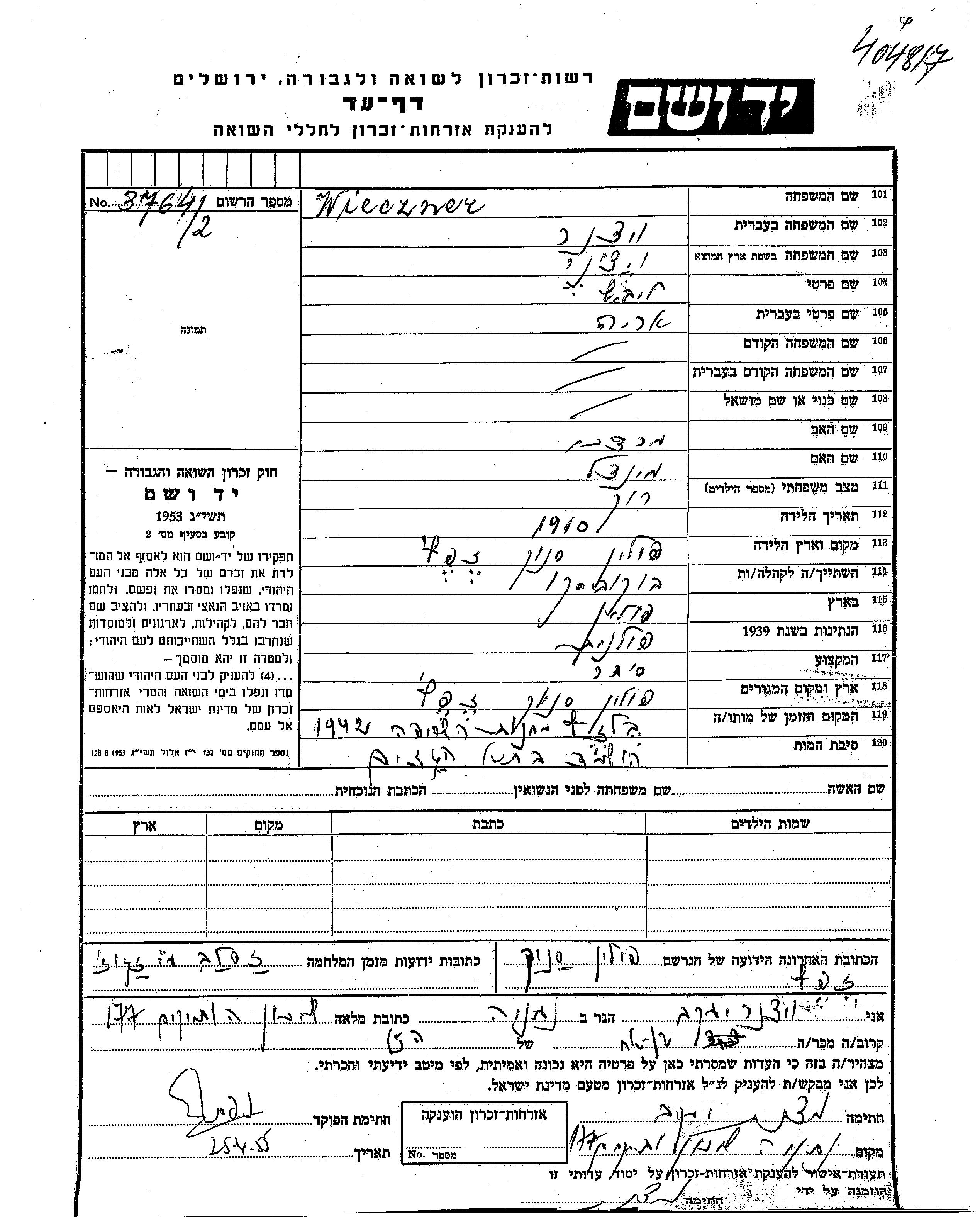 Яд Вашем - Листы свидетельских показаний Мемориального фонда