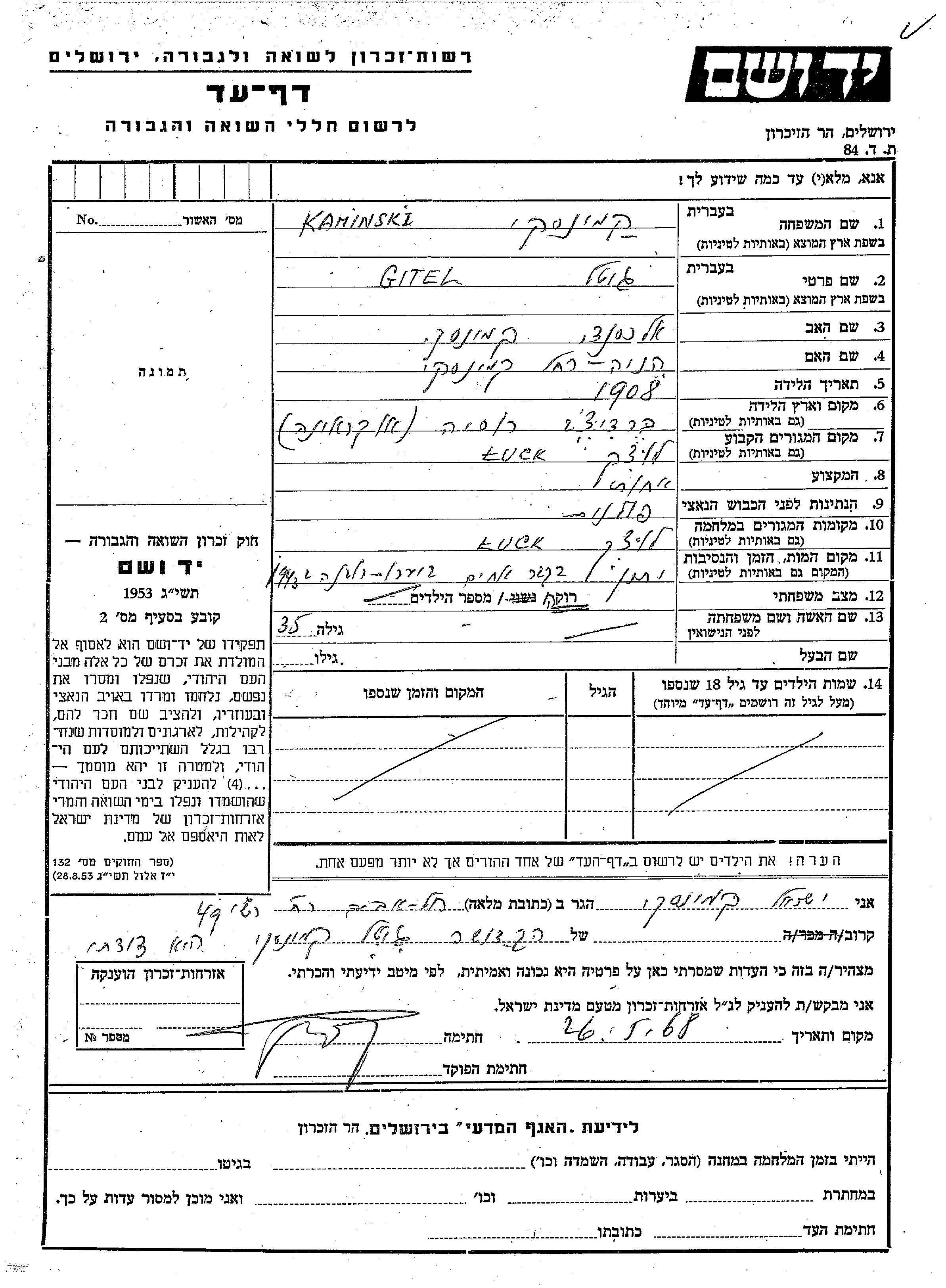 Гитель Камински, место рождения: Бердичев, Украина (СССР). Отец: Александер, mать:Хеня Рахель. Медбрат / медсестра. Холост / не замужем. Место жительства до войны: Луцк, Польша. Место во время войны: Луцк, Польша.