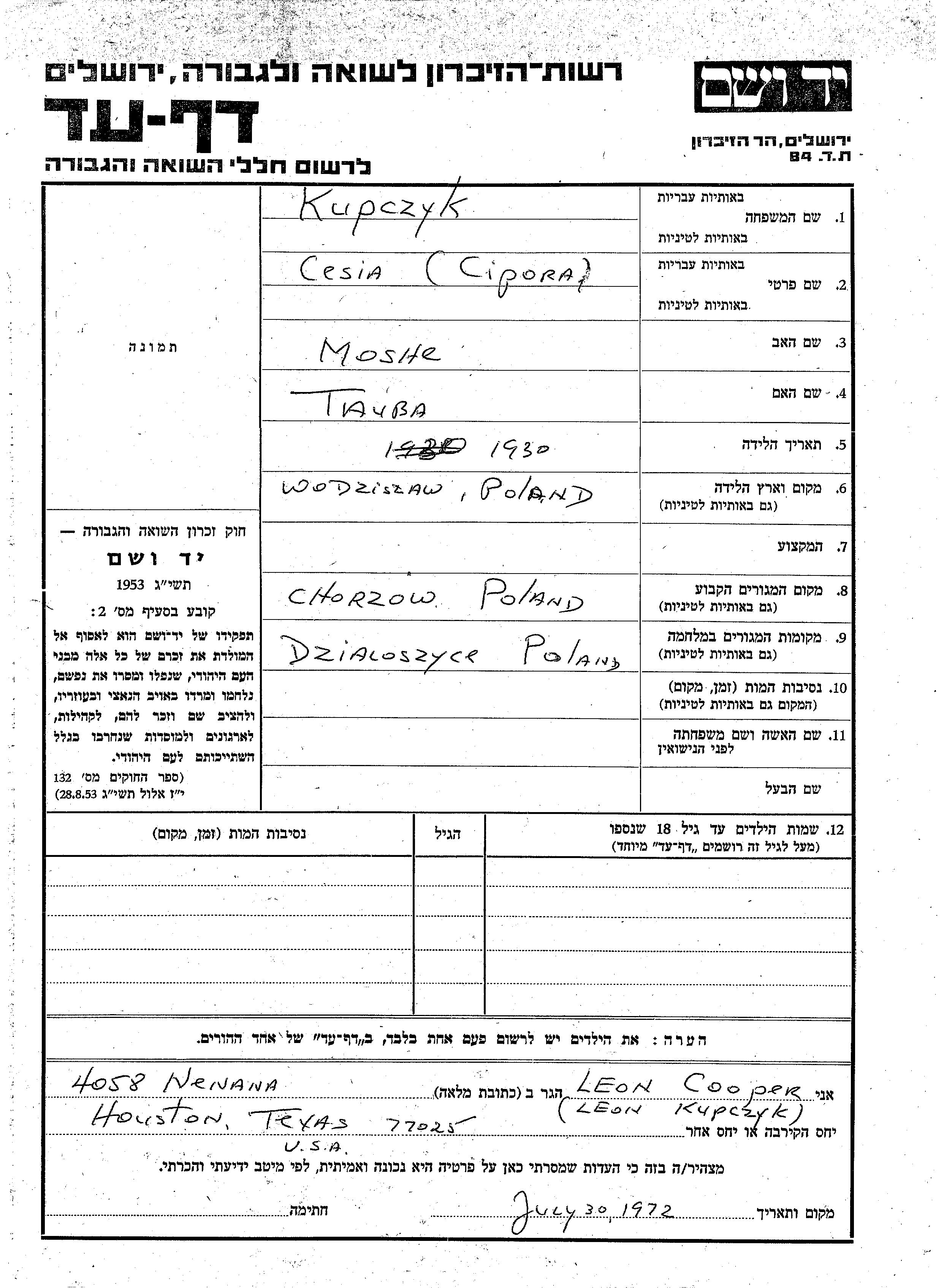 Купчик Цеся Ципора 1930 Хожув, Польша Лист свидетельских показаний