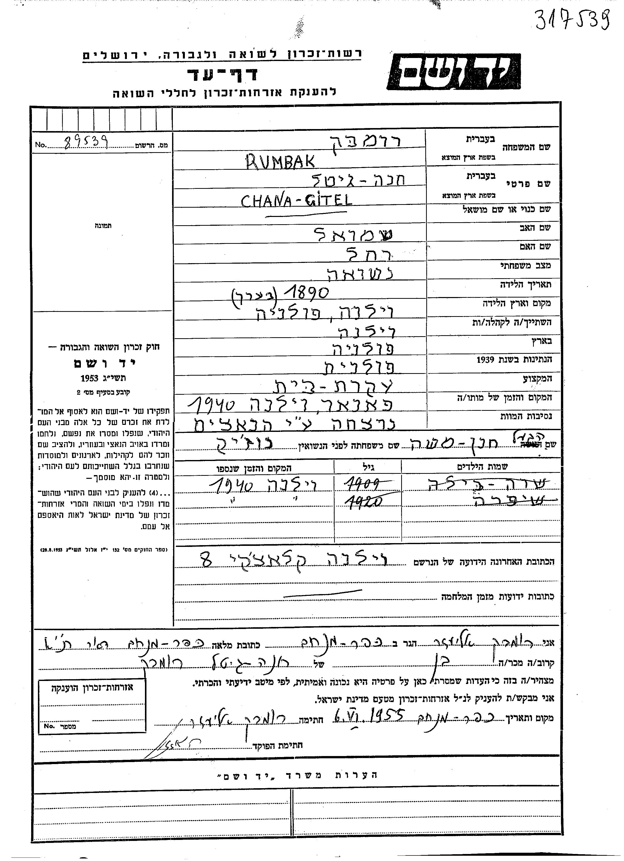 Румбак Хана Гитель 1890 Вильно, Польша Лист свидетельских показаний