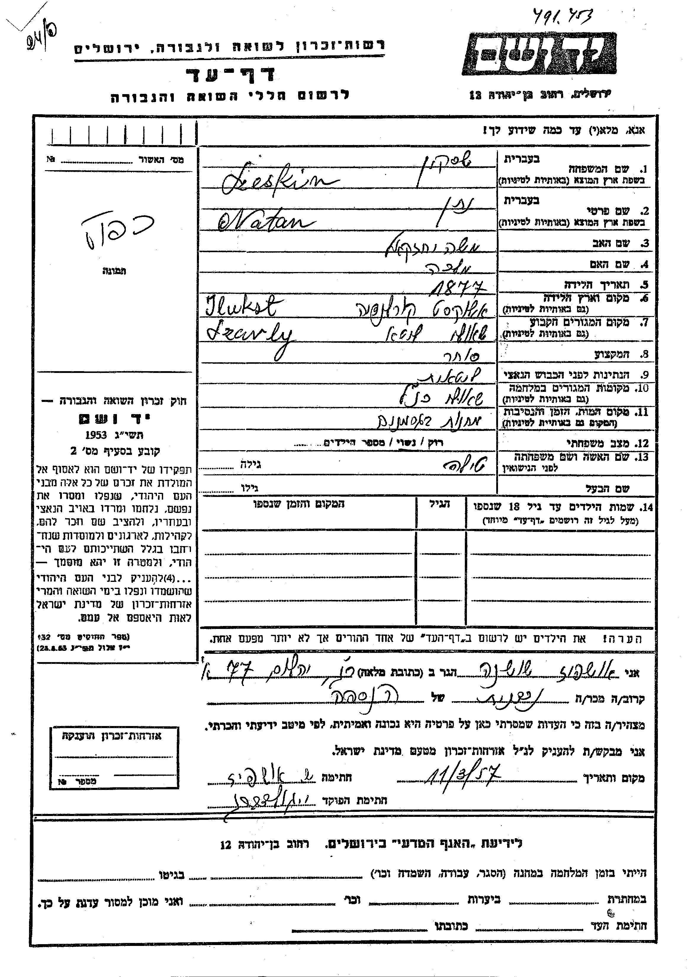 Яд Вашем - Листы свидетельских показаний Мемориального фонда