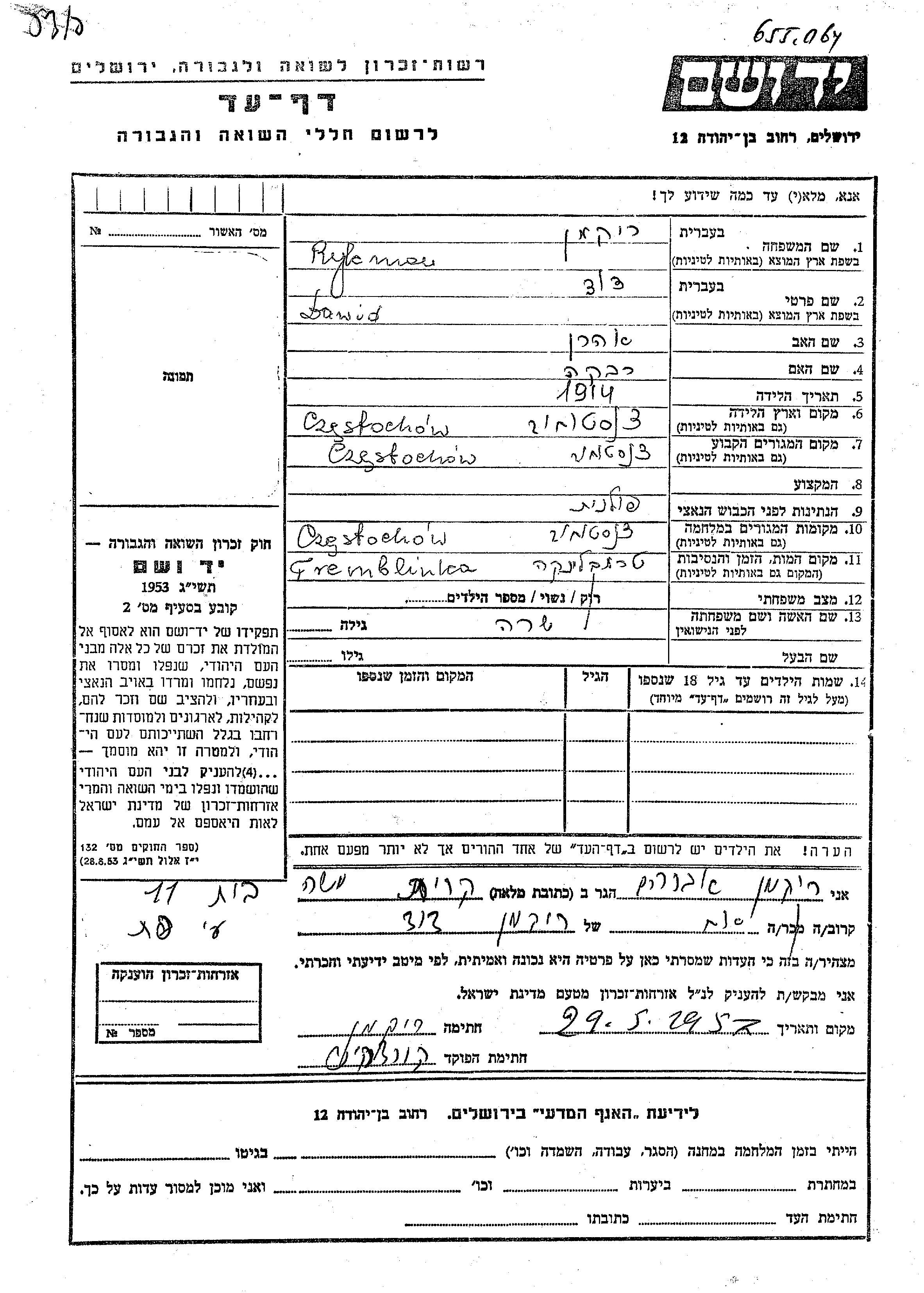 Рыкман Давид 1914 Ченстохов, Польша Лист свидетельских показаний