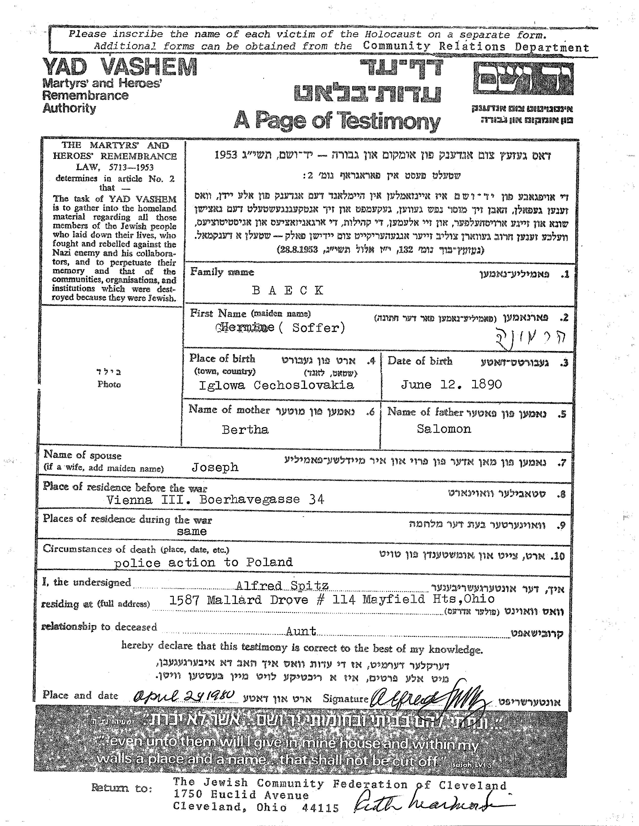 Хермине Бек, девичья фамилия Соффер, место рождения: Йиглава, Чехословакия. Отец: Саломон, mать:Берта. Женат / замужем. Место жительства до войны: Вена, Австрия. Место во время войны: Вена, Австрия.