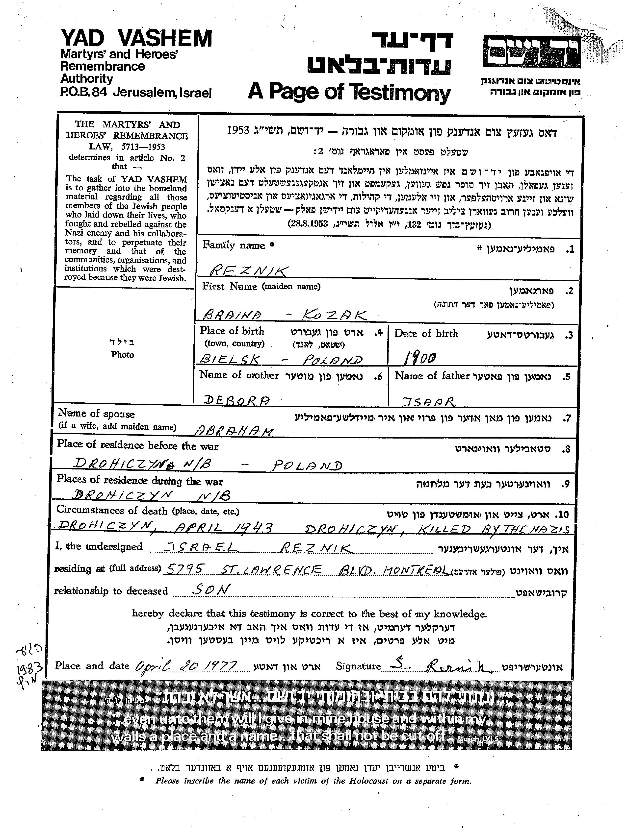 Брайна Резник, девичья фамилия Козак, место рождения: Бельск, Польша. Отец: Исаак, mать:Дебора. Женат / замужем. Место жительства до войны: Дрогичин, Польша. Место во время войны: Дрогичин, Польша.