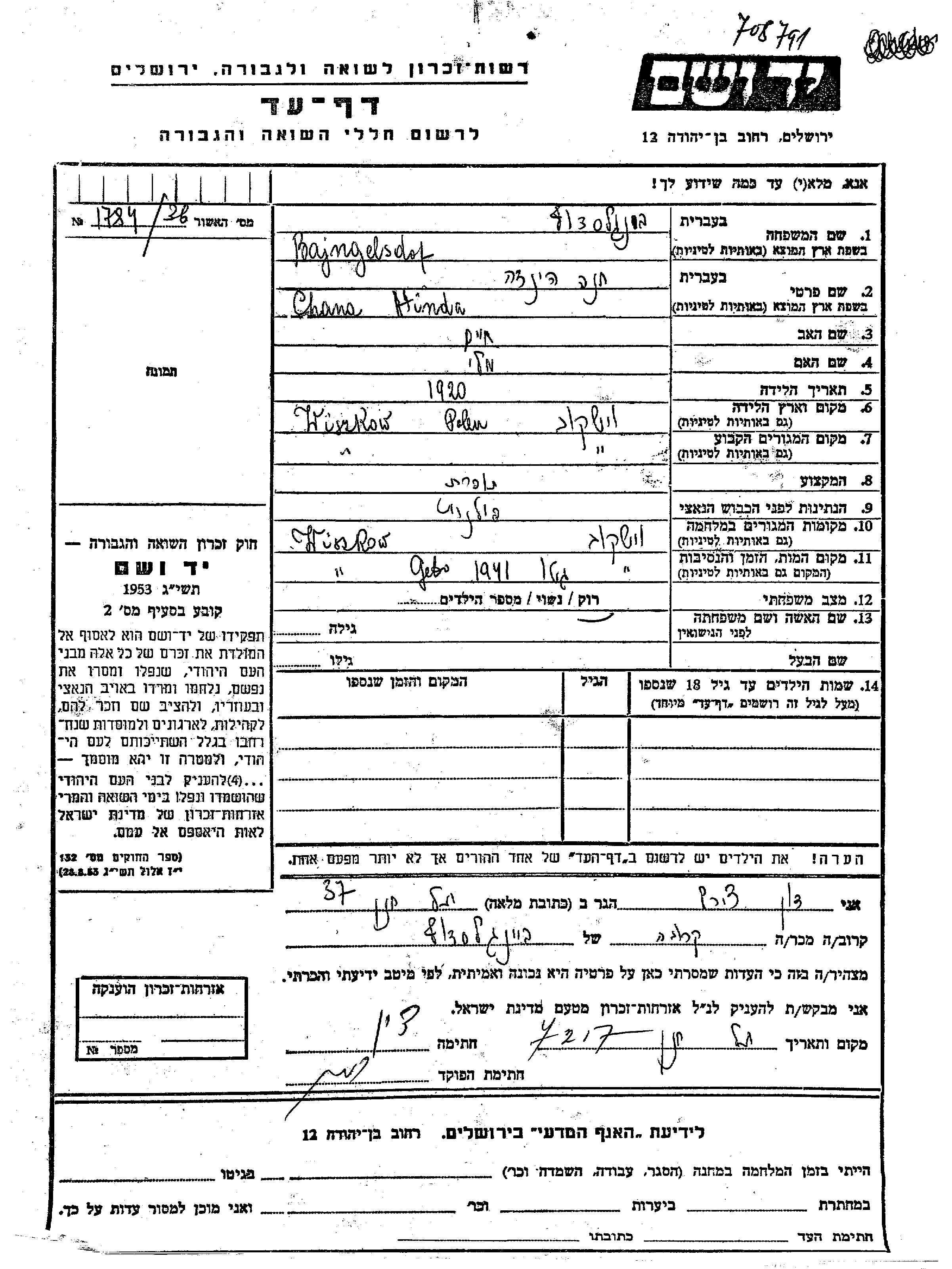 Байнгельсдоф Хана Хинда 1920 Вышков, Польша Лист свидетельских показаний