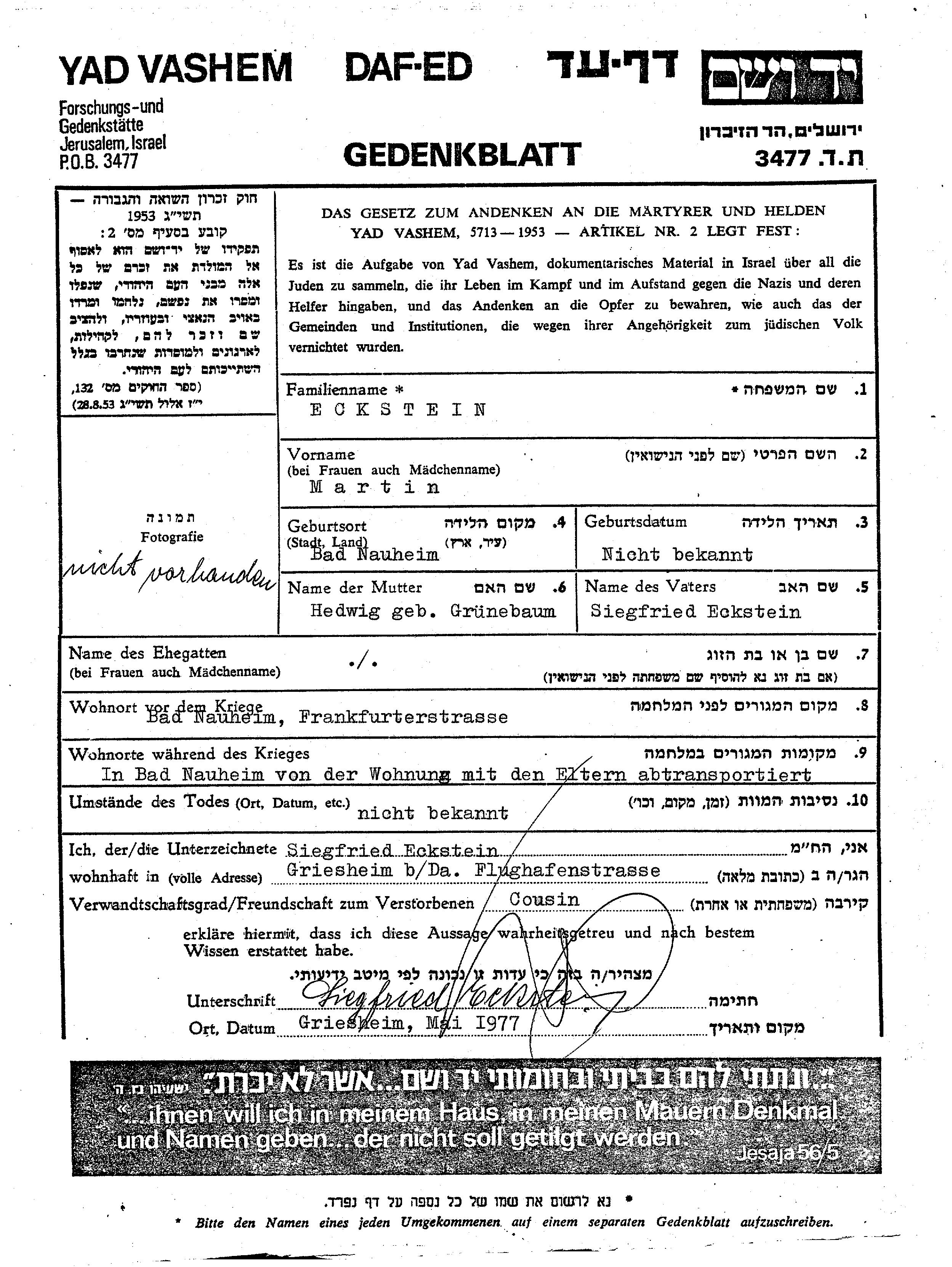 Мартин Экштайн, место рождения: Бад-Наухейм, Германия. Отец: Зигфрид, mать:Хедвиг. Место жительства до войны: Бад-Наухейм, Германия. Место во время войны: Бад-Наухейм, Германия.