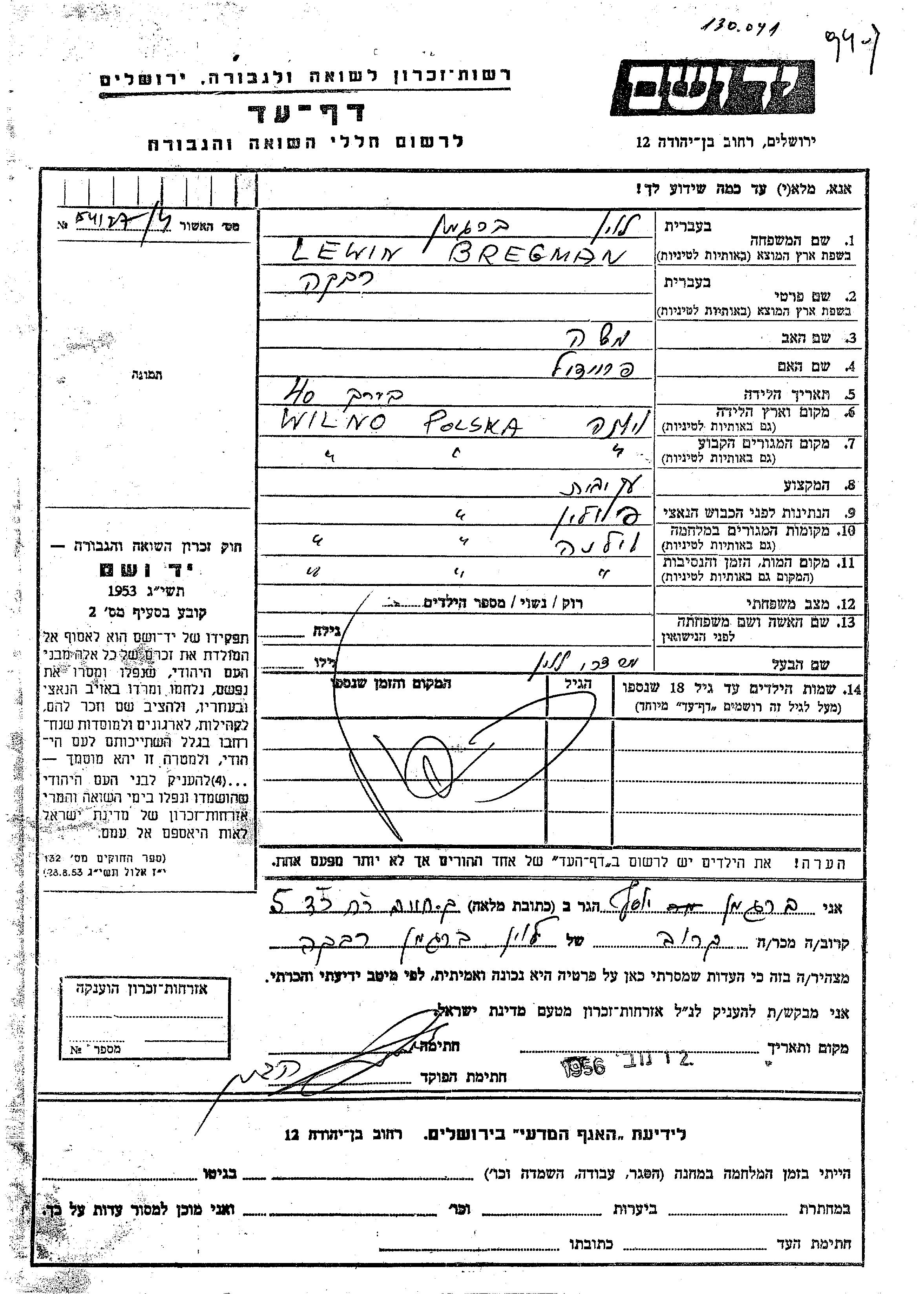 Левин Бергман Ривка Вильно, Польша Лист свидетельских показаний