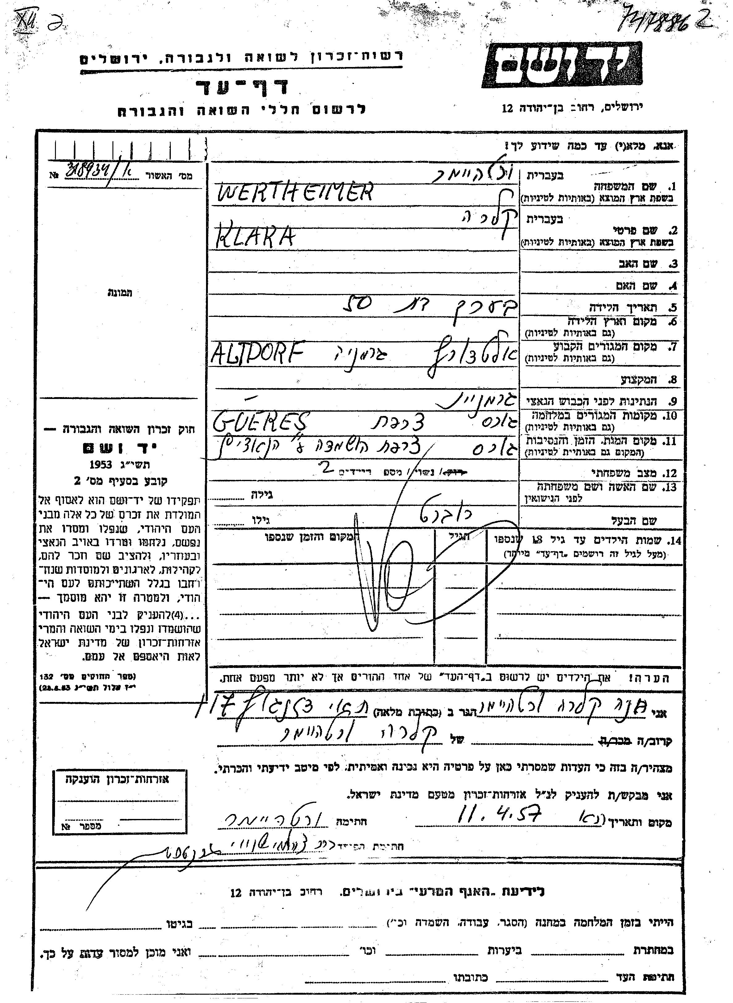 Вертхаймер Клара Альтдорф, Германия Лист свидетельских показаний
