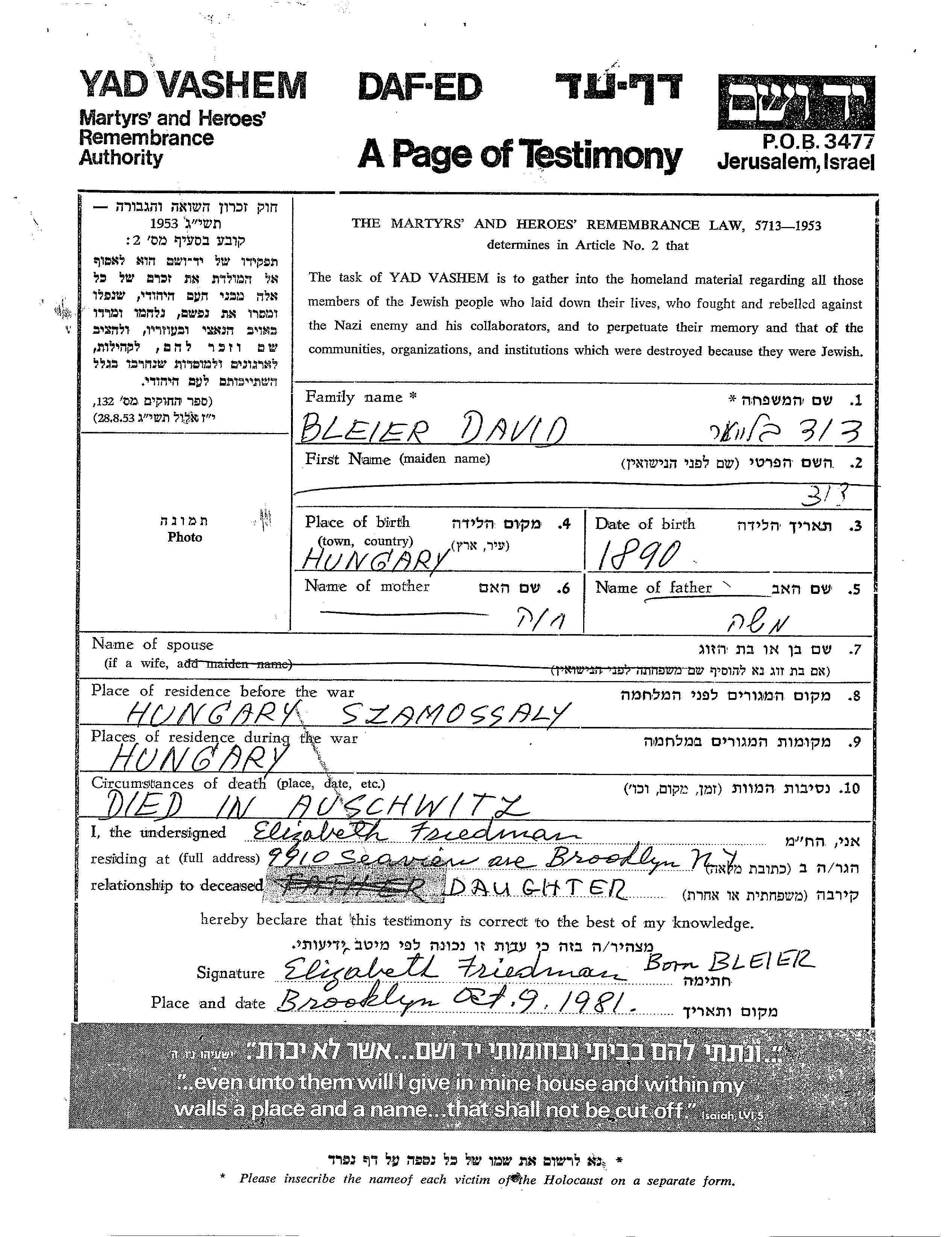 Давид Блайер, место рождения: Венгрия. Отец: Моше, mать:Хая. Место жительства до войны: Самошшайи, Венгрия. Место во время войны: Венгрия.
