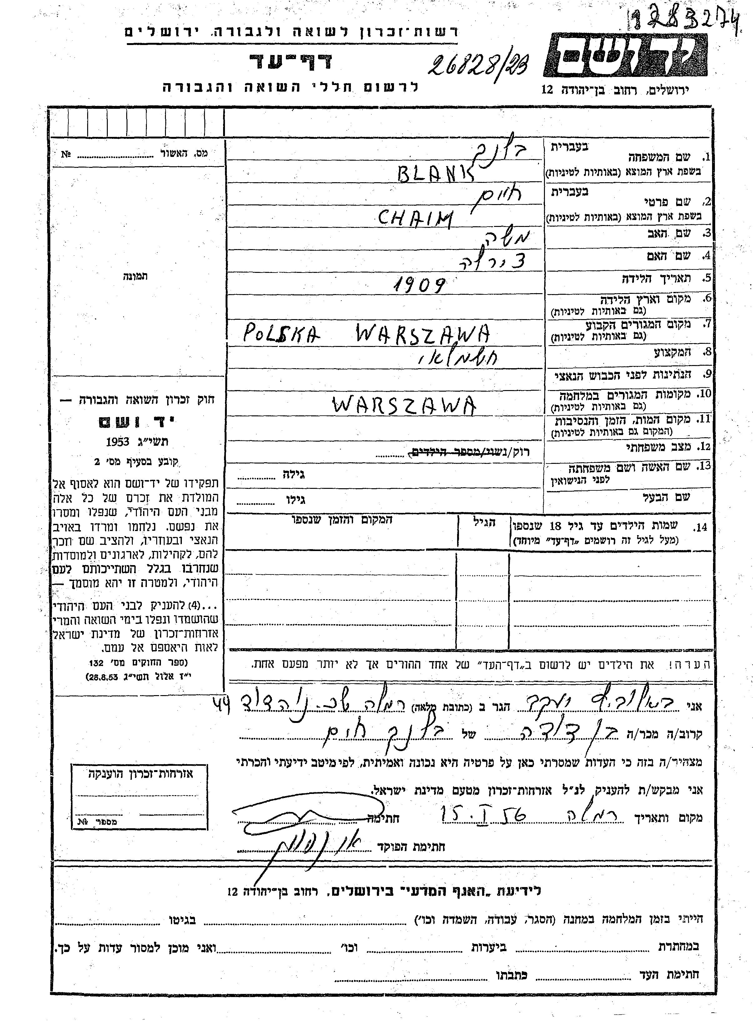 Хаим Бланк. Отец: Моше, mать:Цирла. Электрик. Холост / не замужем. Место жительства до войны: Варшава, Польша. Место во время войны: Варшава, Польша.