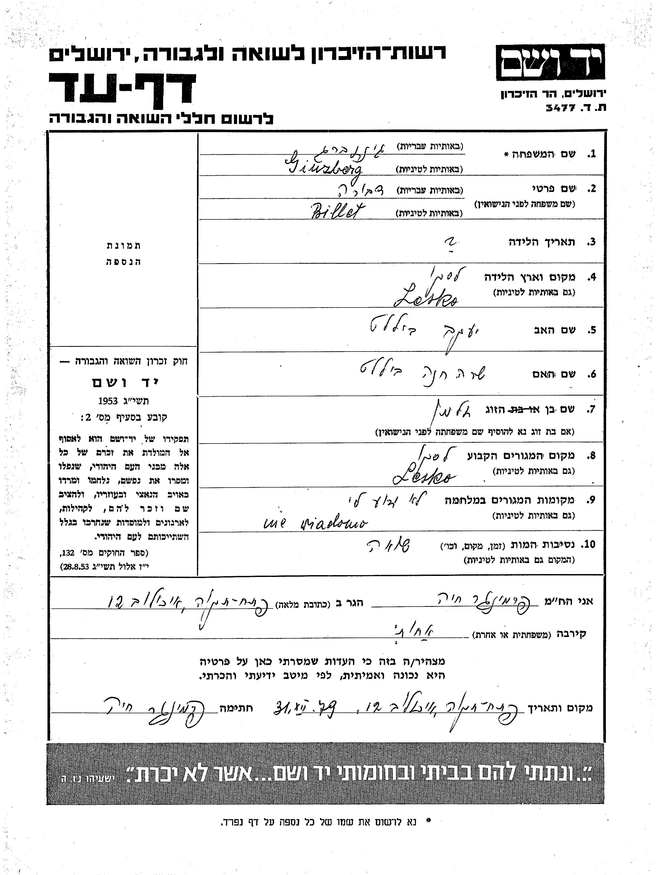 Двора Гинзберг, девичья фамилия Биллет, место рождения: Леско, Польша. Отец: Яков, mать:Сара Хана. Женат / замужем. Место жительства до войны: Леско, Польша.