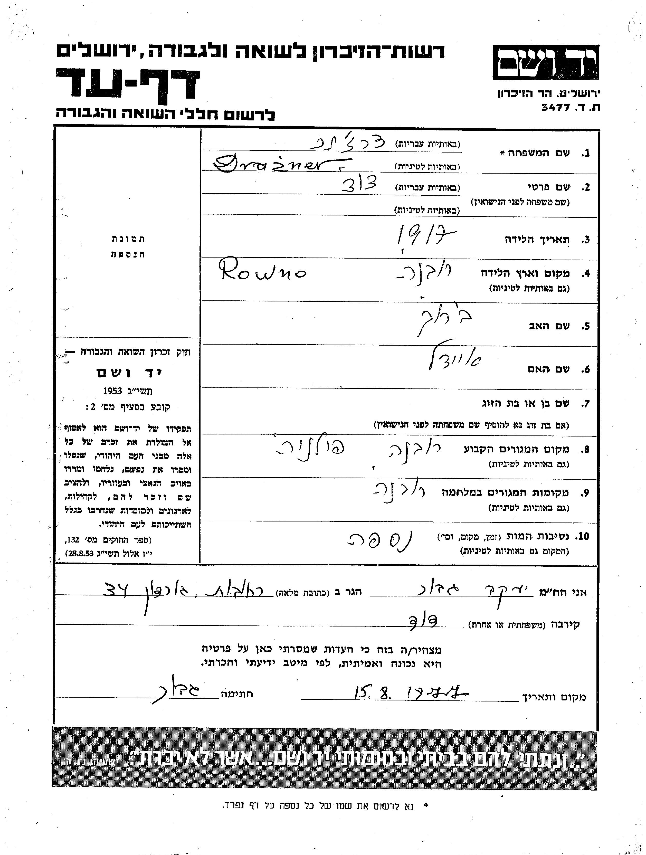Давид Дразнер, место рождения: Ровно, Польша. Отец: Барух, mать:Эйдл. Место жительства до войны: Ровно, Польша. Место во время войны: Ровно, Польша.