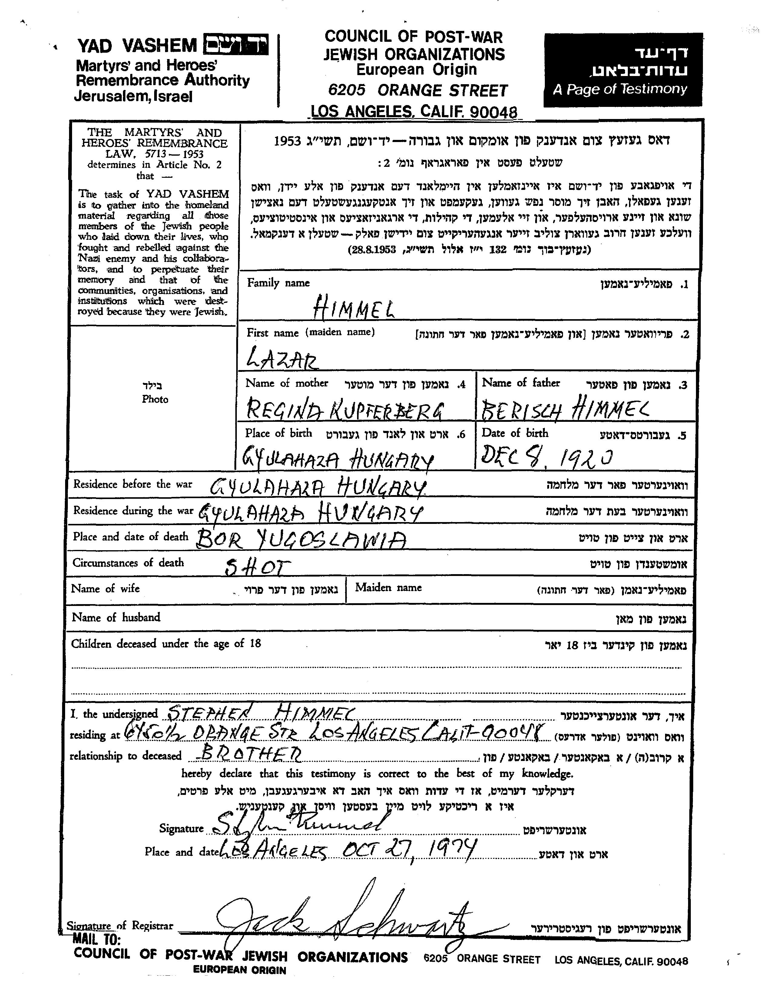 Лазарь Химмель, место рождения: Дьюлахаза, Венгрия. Отец: Бериш, mать:Регина. Место жительства до войны: Дьюлахаза, Венгрия. Место во время войны: Дьюлахаза, Венгрия.