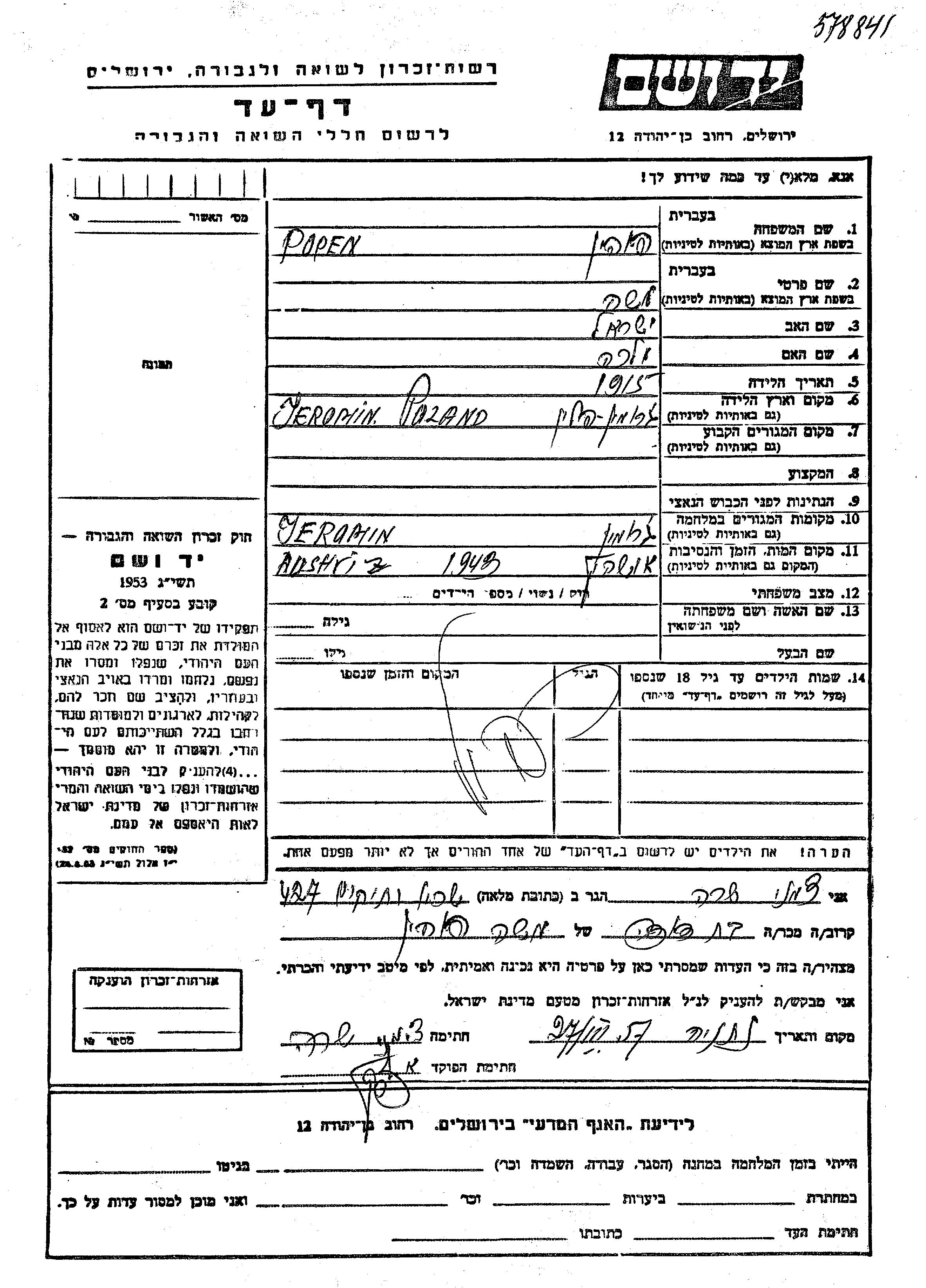 Моше Попен, место рождения: Журомин, Польша. Отец: Исраэль, mать:Малка. Место во время войны: Журомин, Польша.
