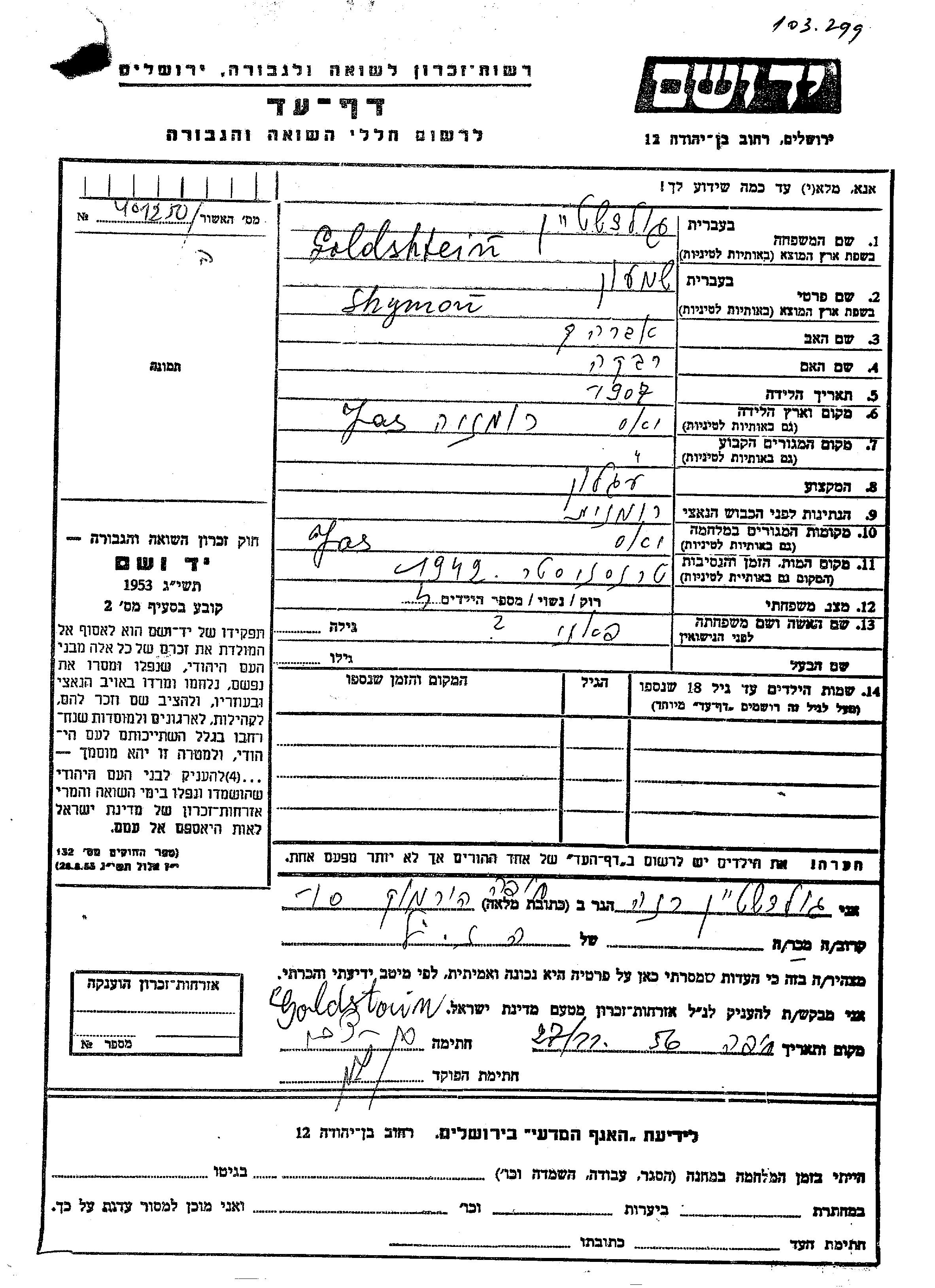 Шимон Гольдштейн, место рождения: Яссы, Румыния. Отец: Авраам, mать:Ривка. Извозчик. Женат / замужем. Место жительства до войны: Яссы, Румыния. Место во время войны: Яссы, Румыния.