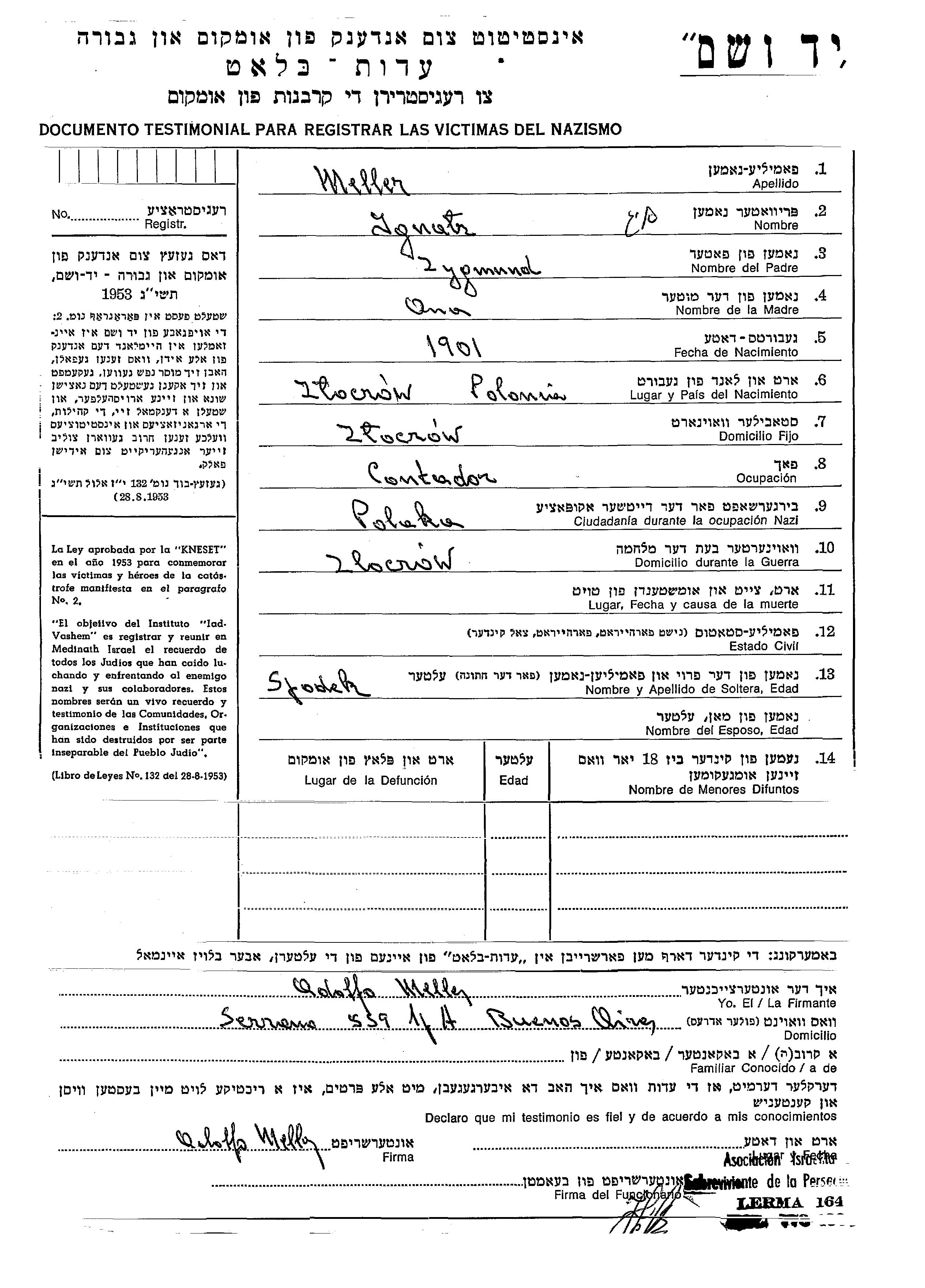 Игнац Меллер, место рождения: Злочов, Польша. Отец: Зигмунд, mать:Ана. Бухгалтер / счетовод. Женат / замужем. Место жительства до войны: Злочов, Польша. Место во время войны: Злочов, Польша.