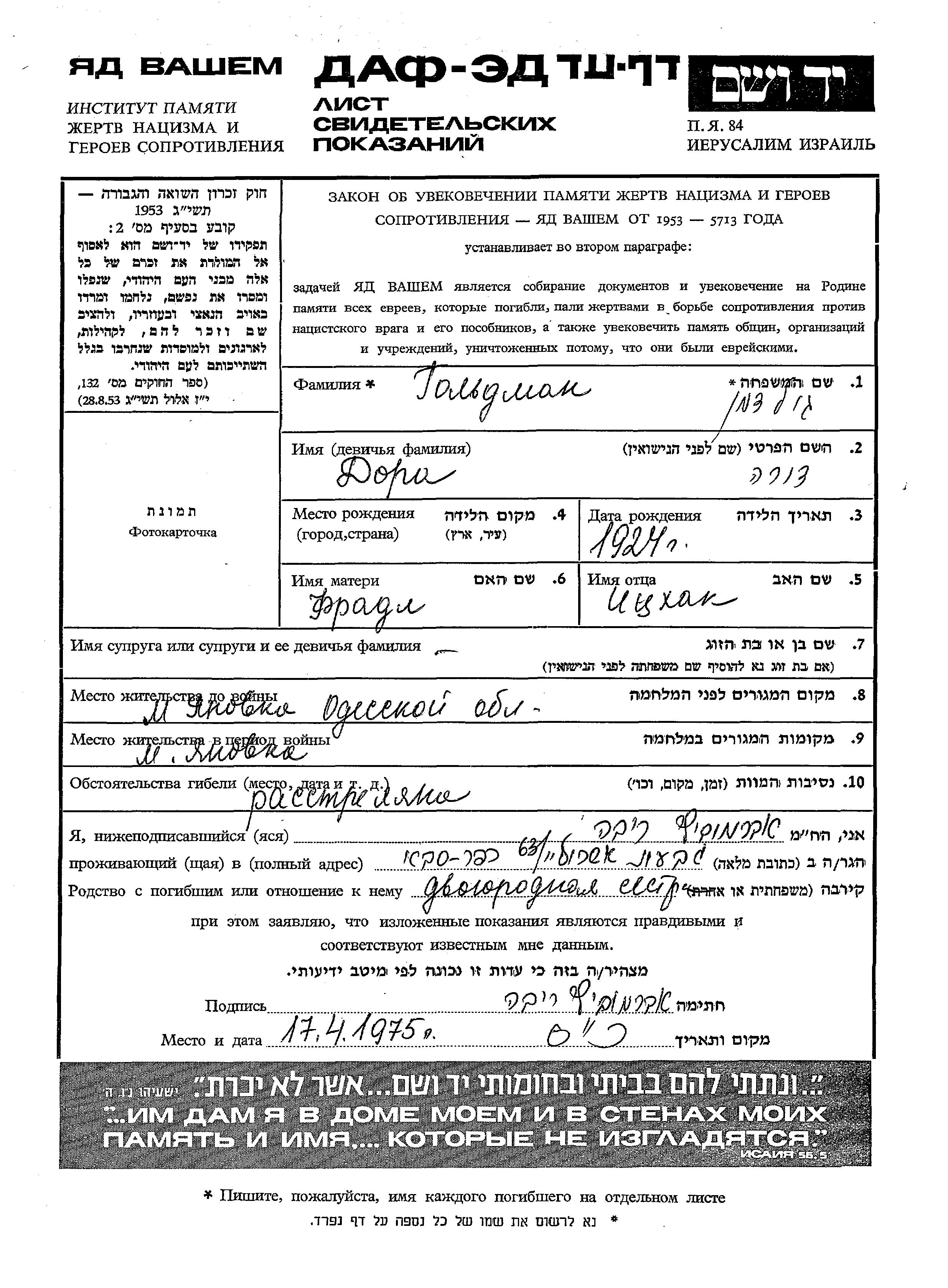 Гольдман Дора 1924 Яновка, Украина (СССР) Лист свидетельских показаний