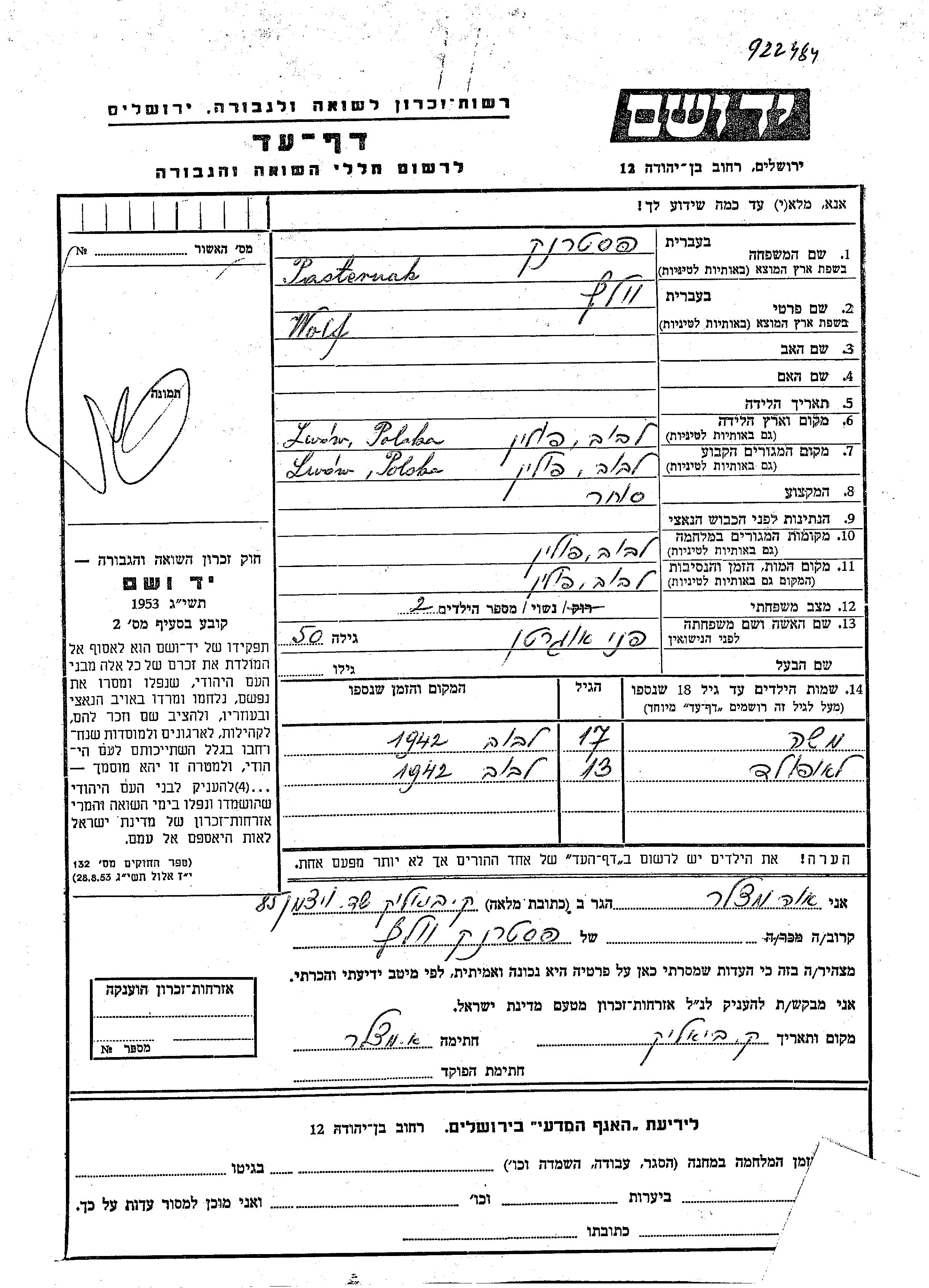 Вольф Пастернак, место рождения: Львов, Польша. Женат / замужем. Место жительства до войны: Львов, Польша. Место во время войны: Львов, Польша.