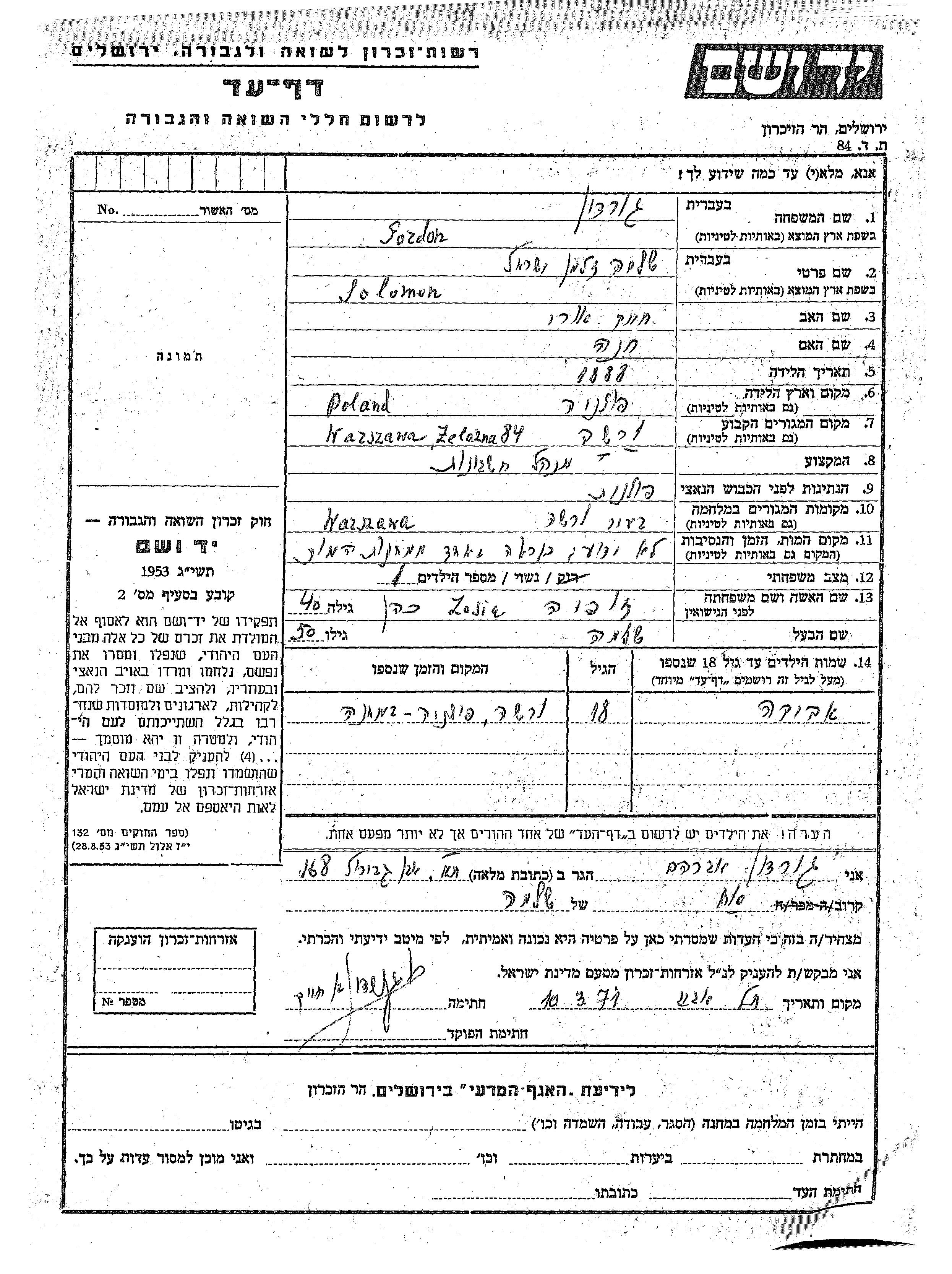 Соломон Исраэль Залман Гордон, место рождения: Польша. Отец: Хаим Ури, mать:Хана. Бухгалтер / счетовод. Женат / замужем. Место жительства до войны: Варшава, Польша. Место во время войны: Варшава, Польша.