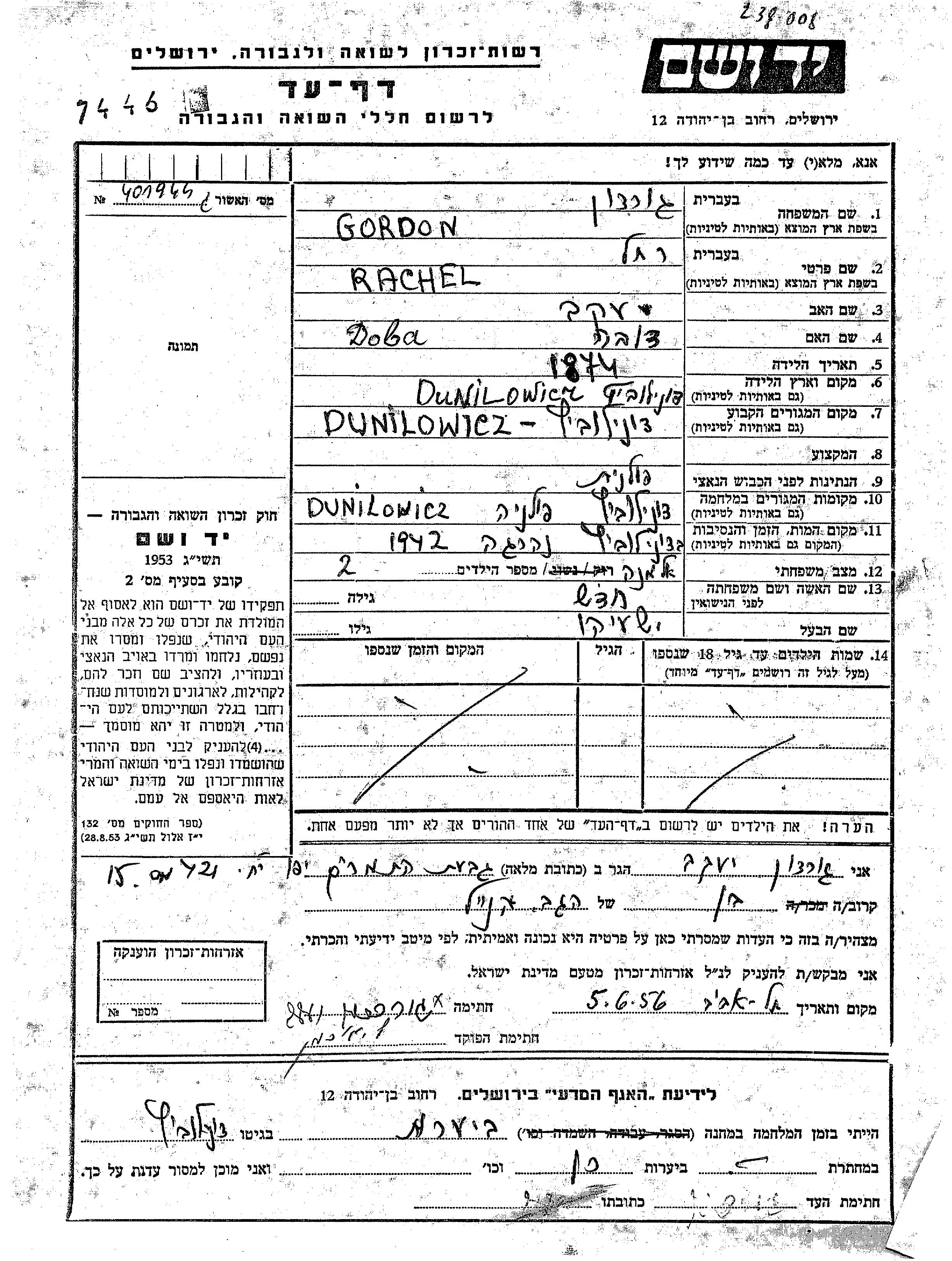 Рахель Гордон, девичья фамилия Хадаш, место рождения: Дуниловичи, Польша. Отец: Яков, mать:Доба. Вдова. Место жительства до войны: Дуниловичи, Польша. Место во время войны: Дуниловичи, Польша.