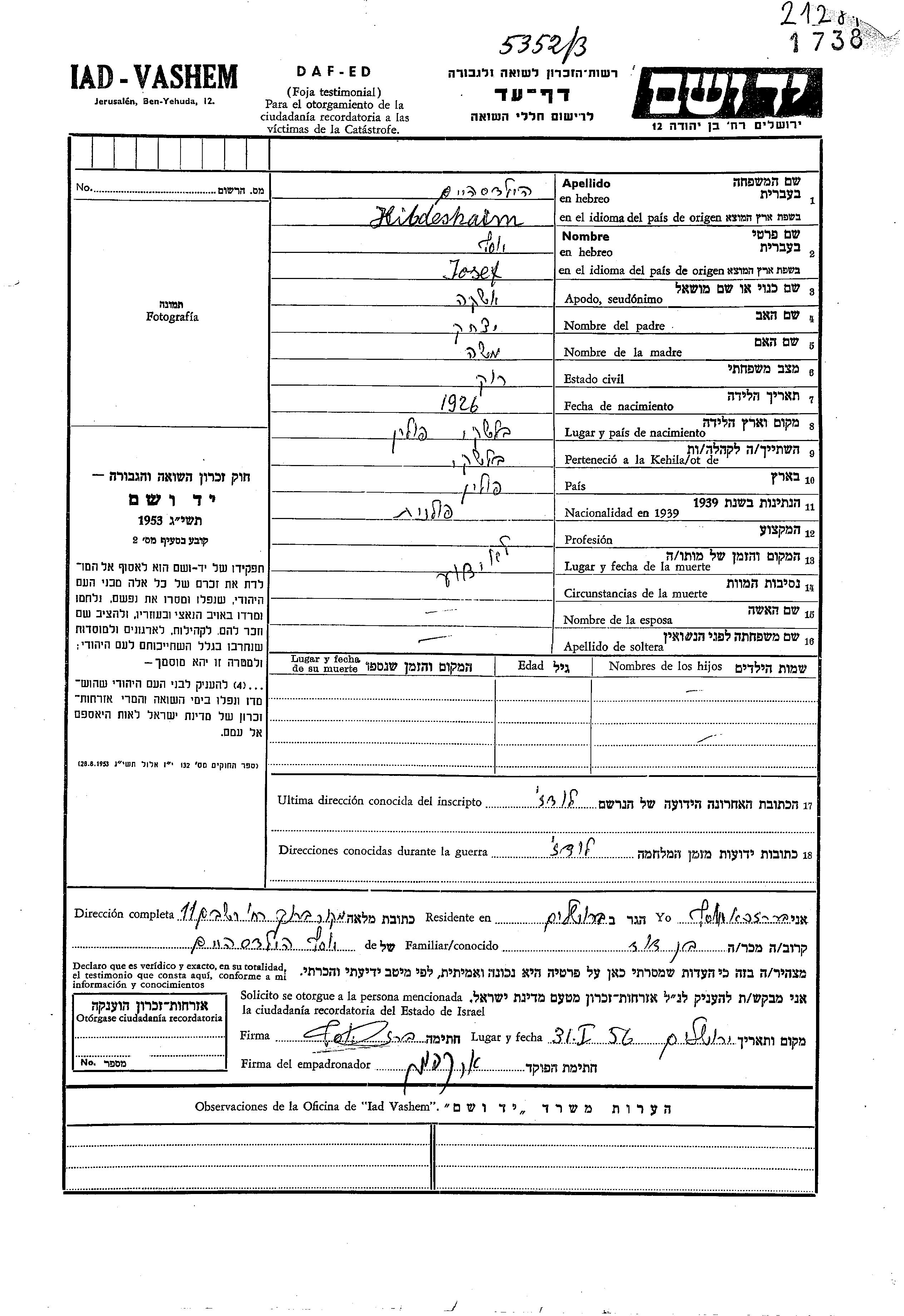 Йосеф Эшка Хильдесхайм, место рождения: Блашки, Польша. Отец: Ицхак, mать:Моше. Холост / не замужем. Место жительства до войны: Польша. Место во время войны: Лодзь, Польша.
