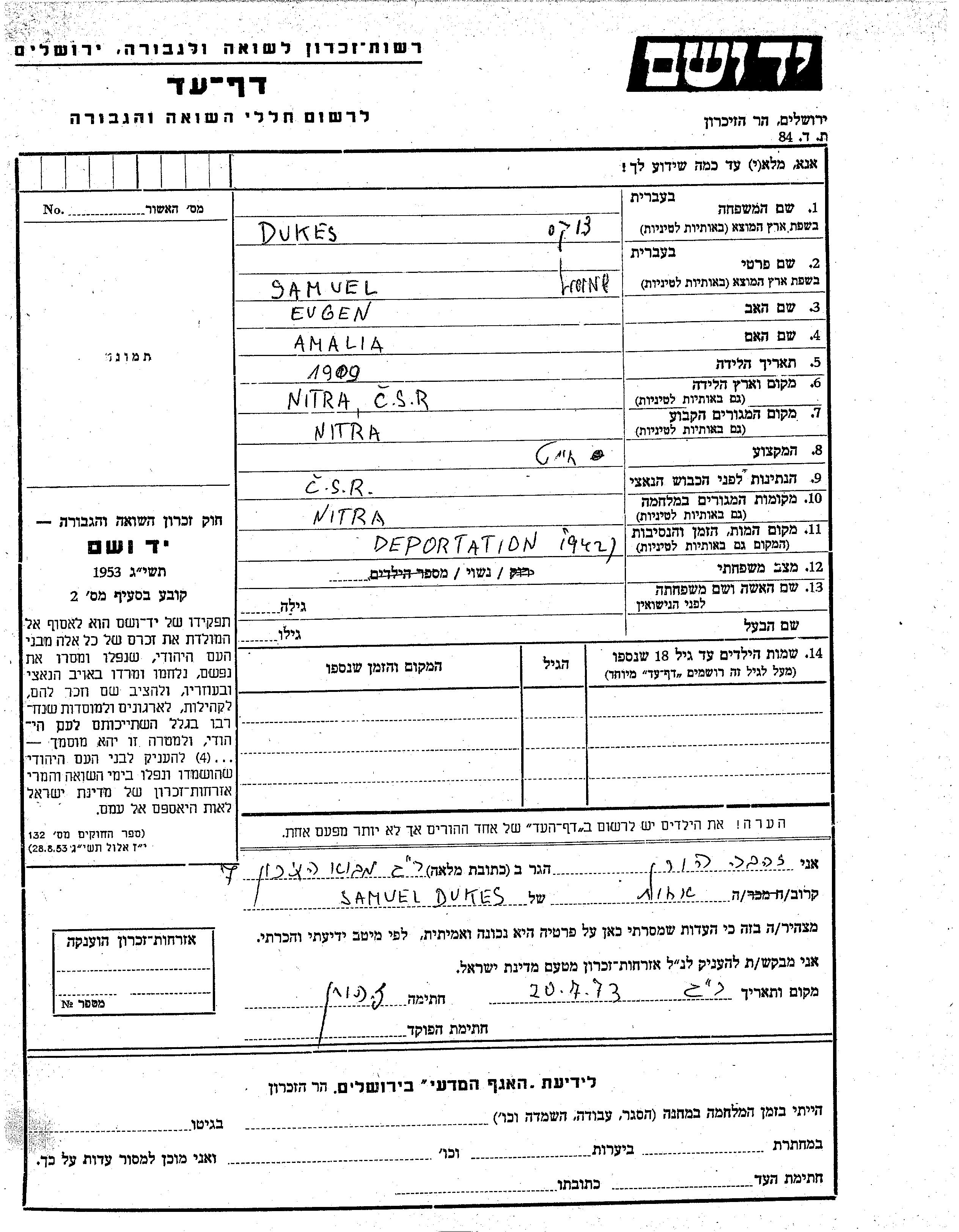 Дукес Шмуэль 1909 Нитра, Чехословакия Лист свидетельских показаний
