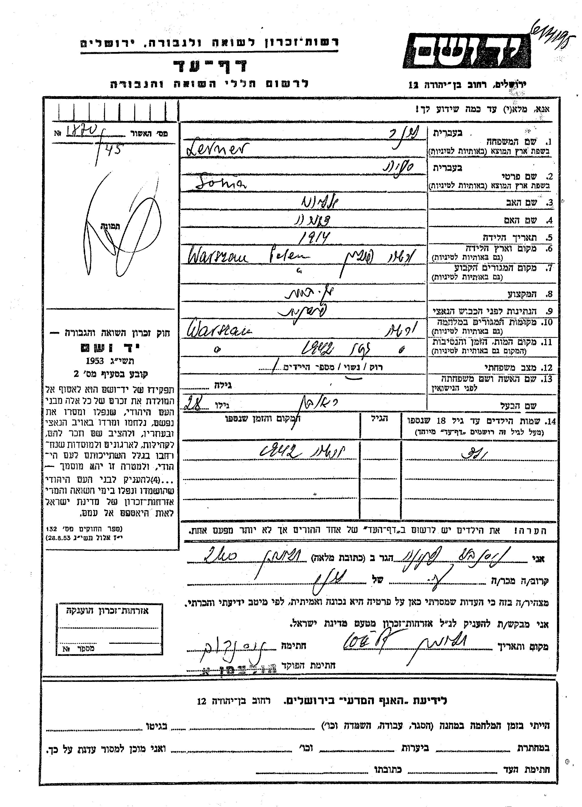 Соня Лернер, место рождения: Варшава, Польша. Отец: Элиот, mать:Двора. Домохозяйка. Женат / замужем. Место жительства до войны: Варшава, Польша. Место во время войны: Варшава, Польша.