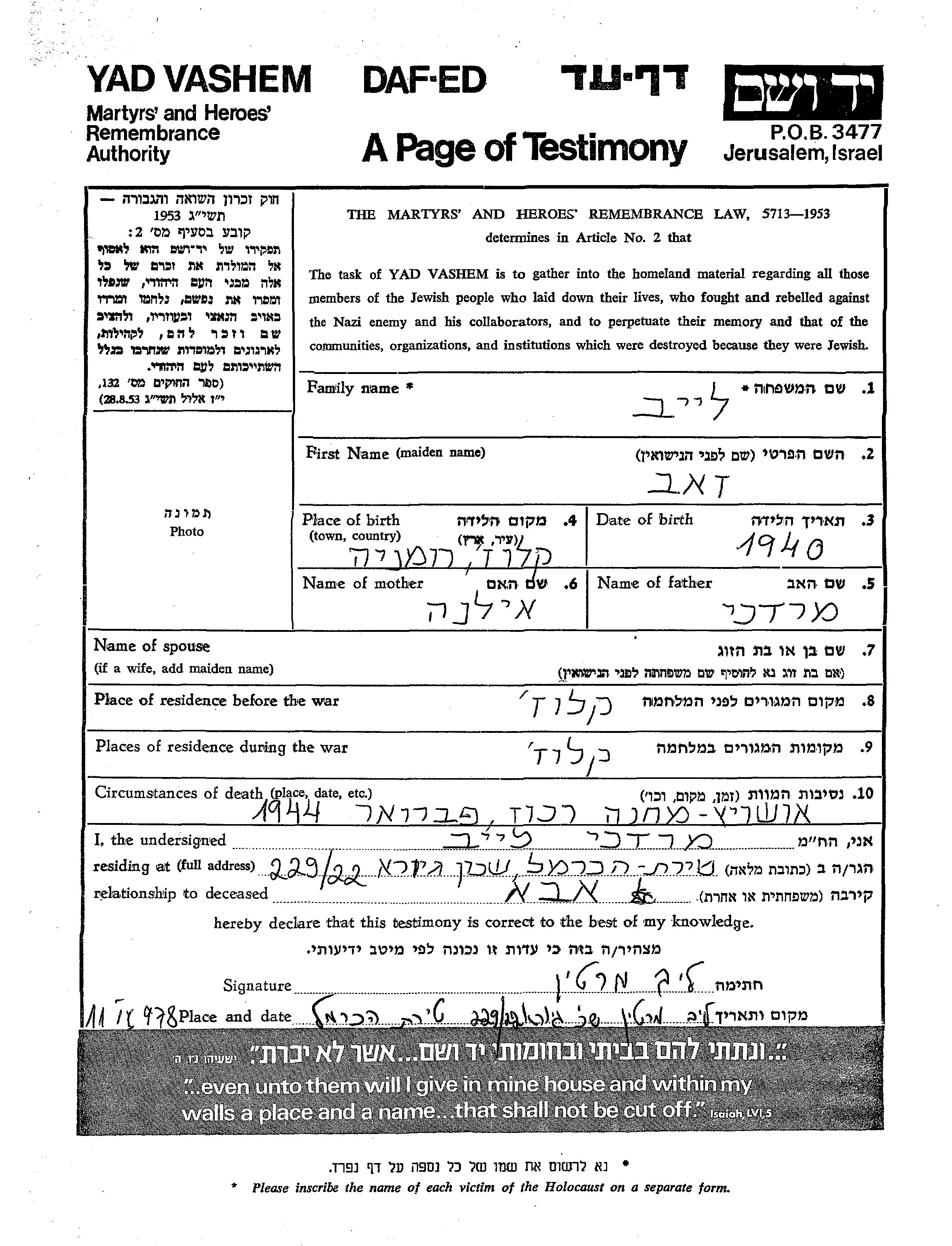 Лейб Зеев 1940 Клуж, Румыния Лист свидетельских показаний