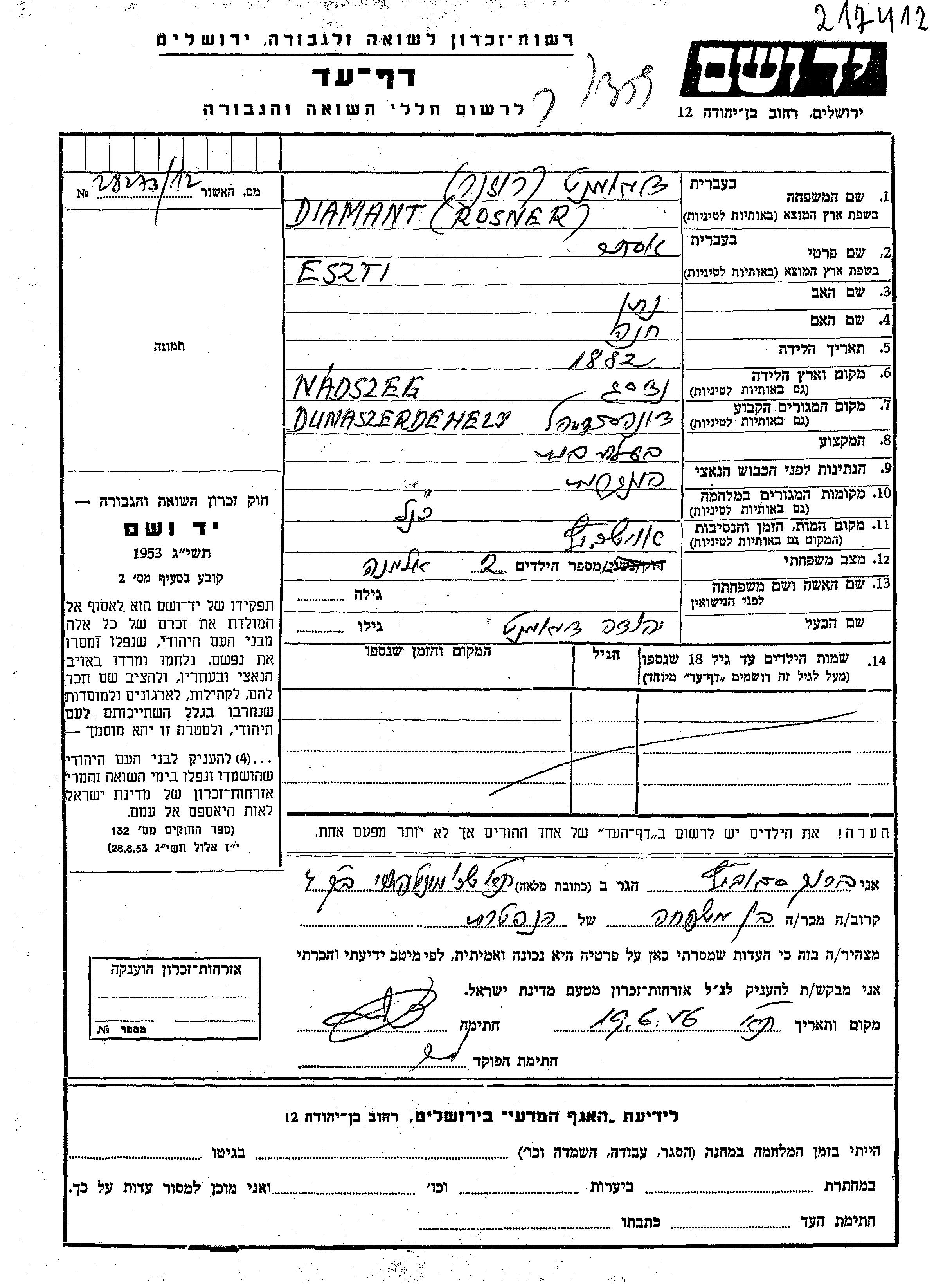 Эсти Диамант, девичья фамилия Рознер, место рождения: Надсег, Чехословакия. Отец: Натан, mать:Хана. Домохозяйка. Вдова. Место жительства до войны: Дунасердахей, Чехословакия. Место во время войны: Дунасердахей, Чехословакия.