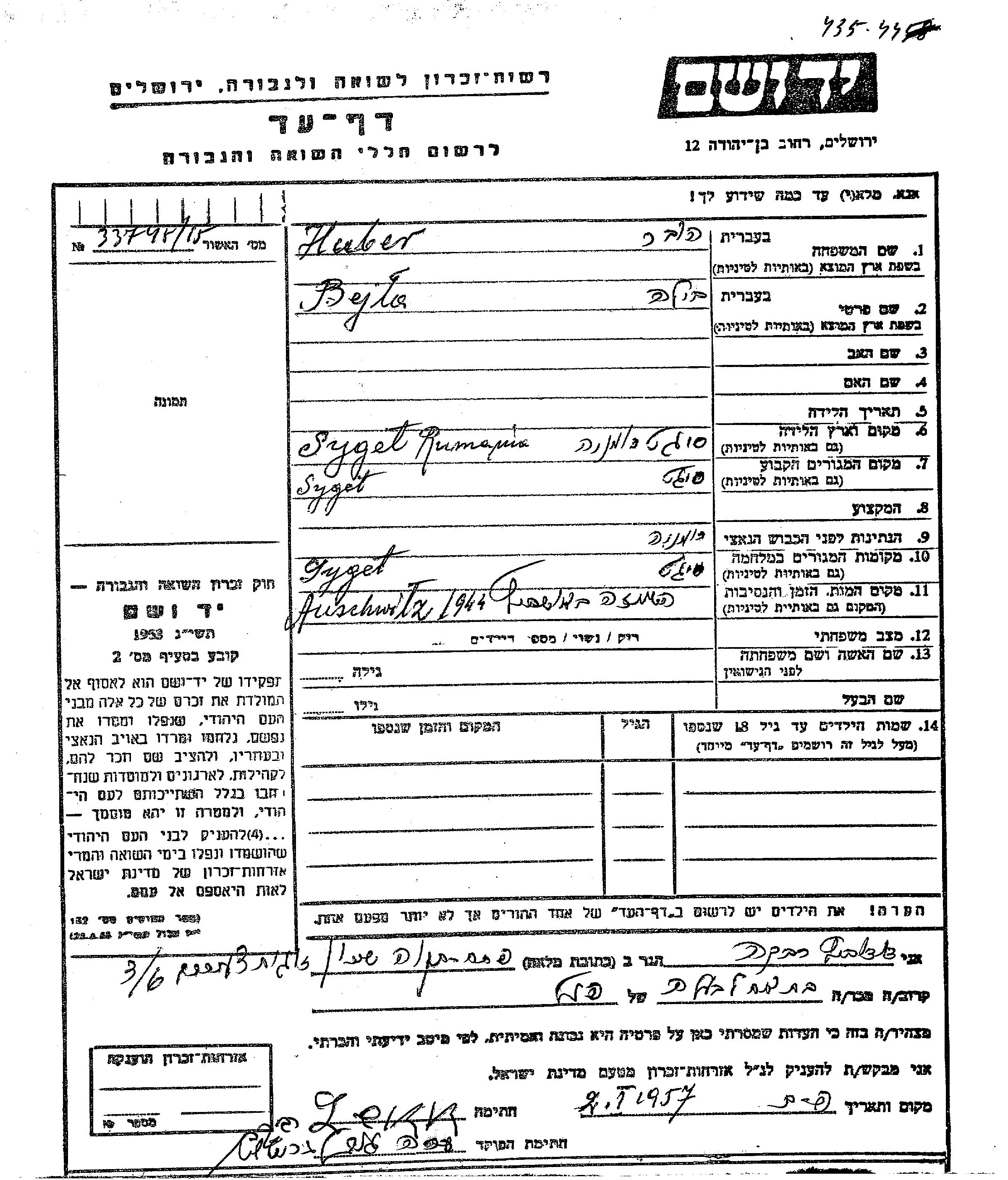 Бейла Хубер, место рождения: Сигет, Румыния. Место жительства до войны: Сигет, Румыния. Место во время войны: Сигет, Румыния.