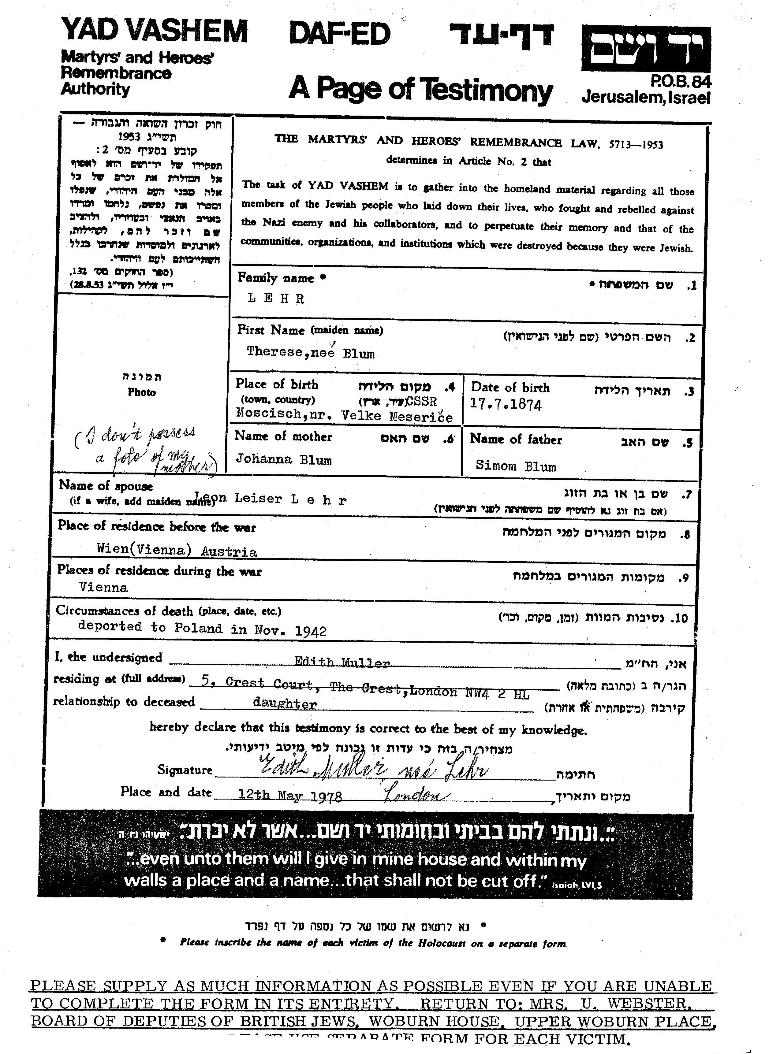 Терезе Лер, девичья фамилия Блум, место рождения: Велке Мезиржичи, Чехословакия. Отец: Симон, mать:Йохана. Женат / замужем. Место жительства до войны: Вена, Австрия. Место во время войны: Вена, Австрия.