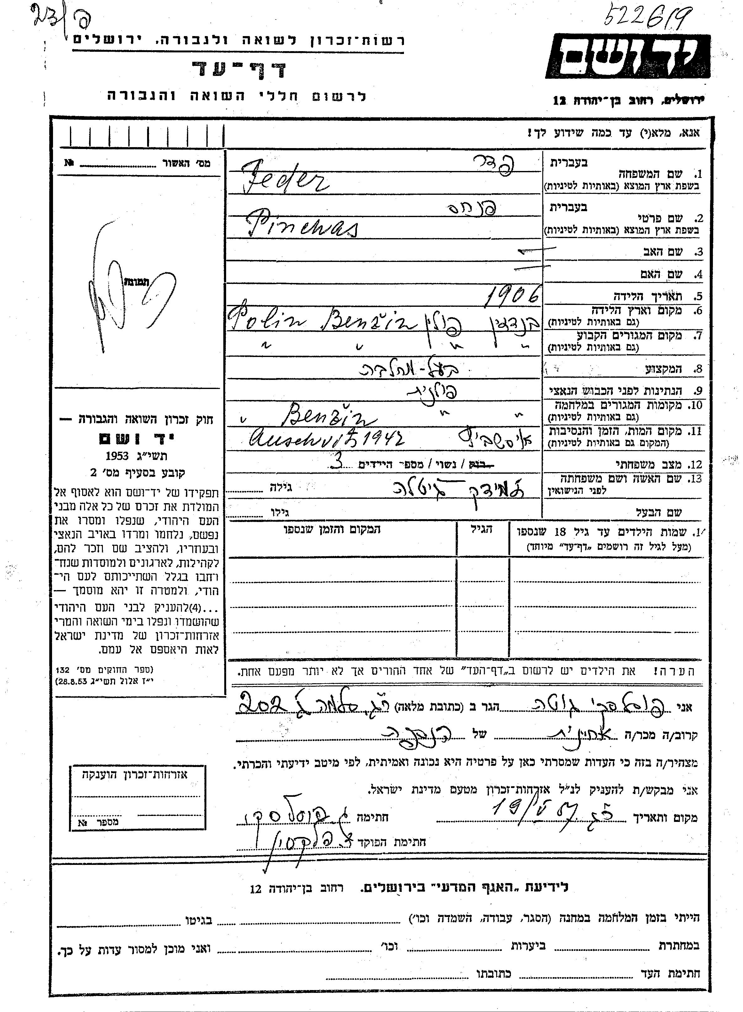 Федер Пинхас 1906 Бендзин, Польша Лист свидетельских показаний