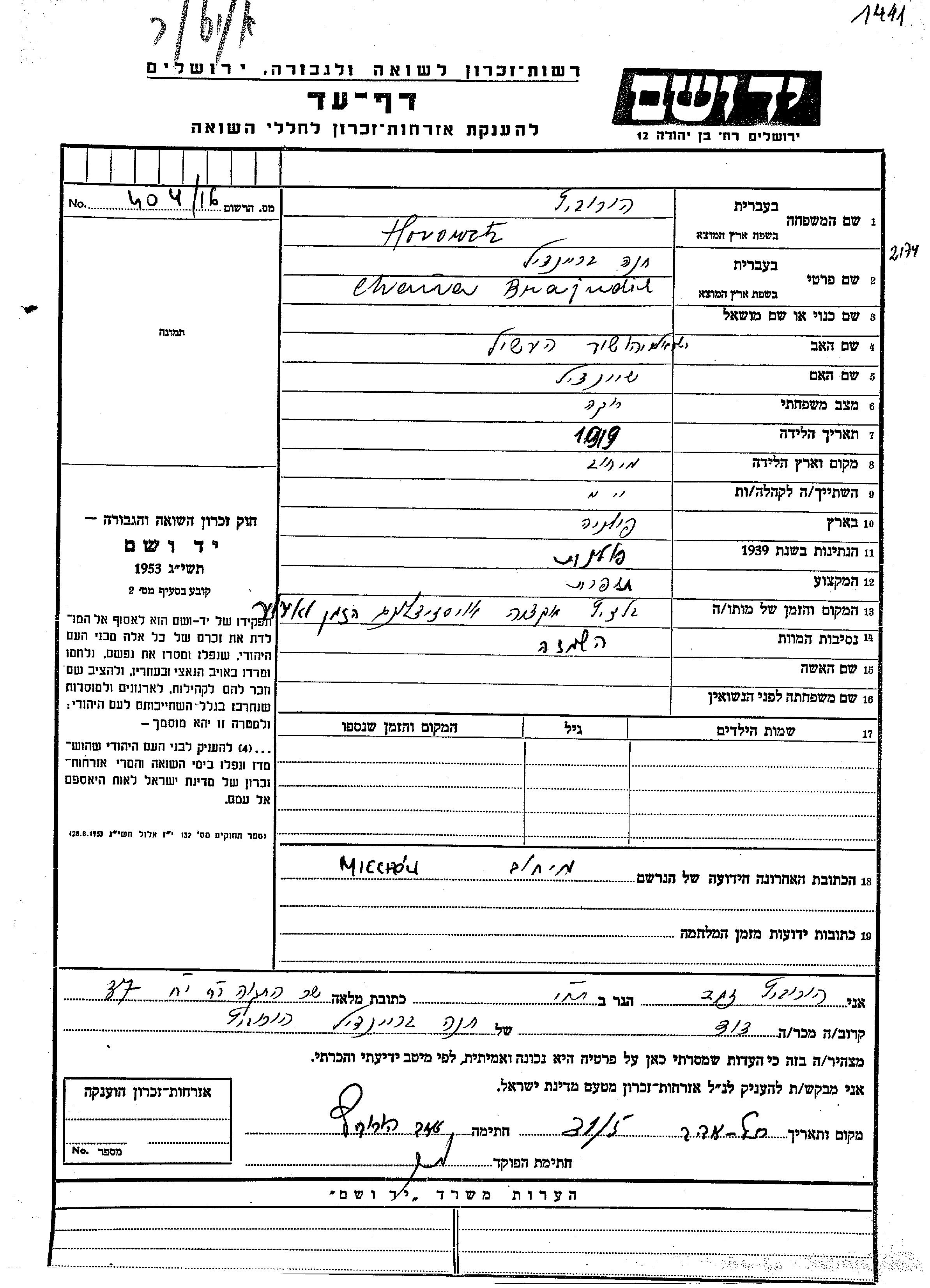Хоровиц Ханна Брайндиль 1919 Мехув, Польша Лист свидетельских показаний