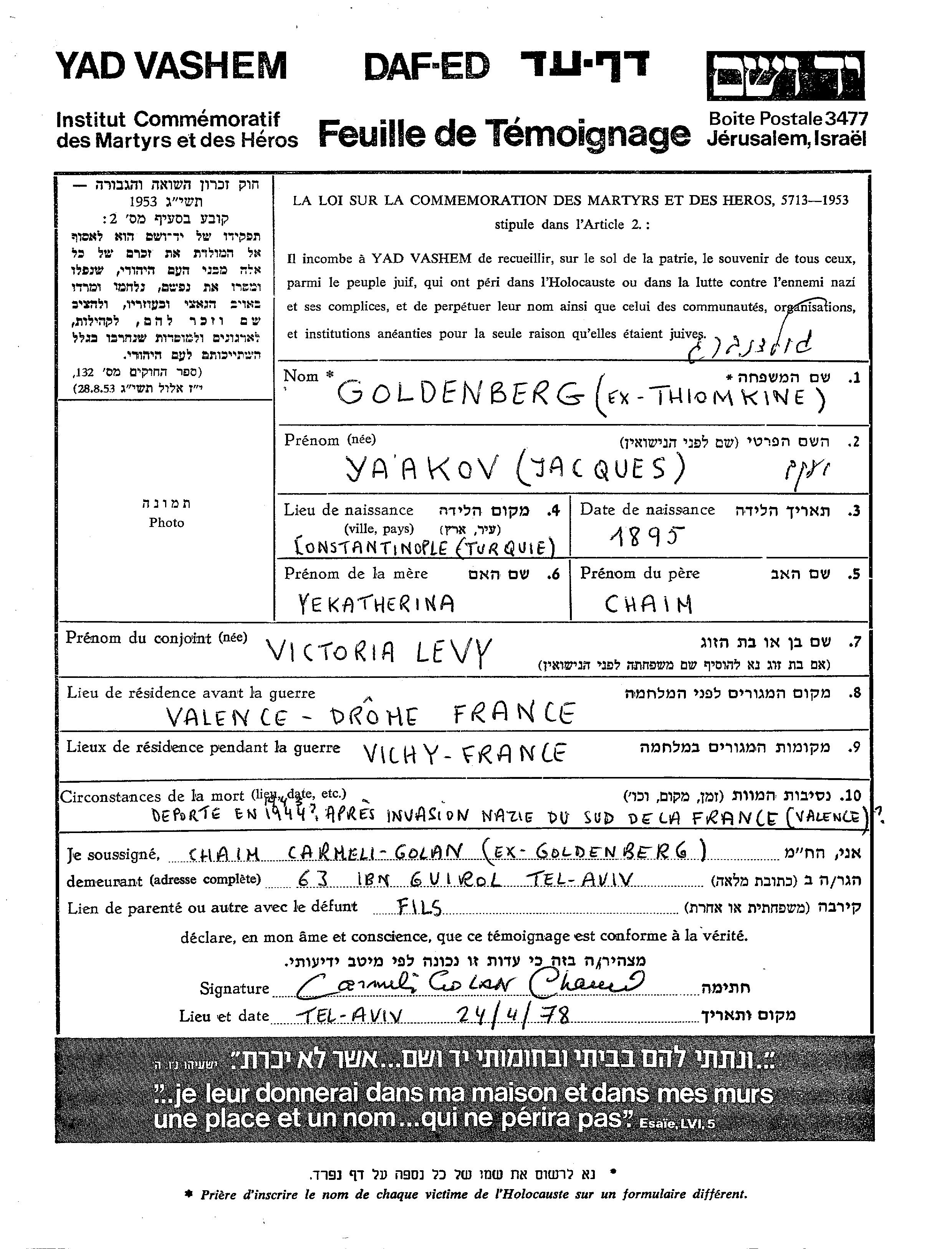 Жак Тёмкин Гольденберг, место рождения: Константинополь, Турция. Отец: Хаим, mать:Екатерина. Женат / замужем. Место жительства до войны: Валанс, Франция. Место во время войны: Виши, Франция.