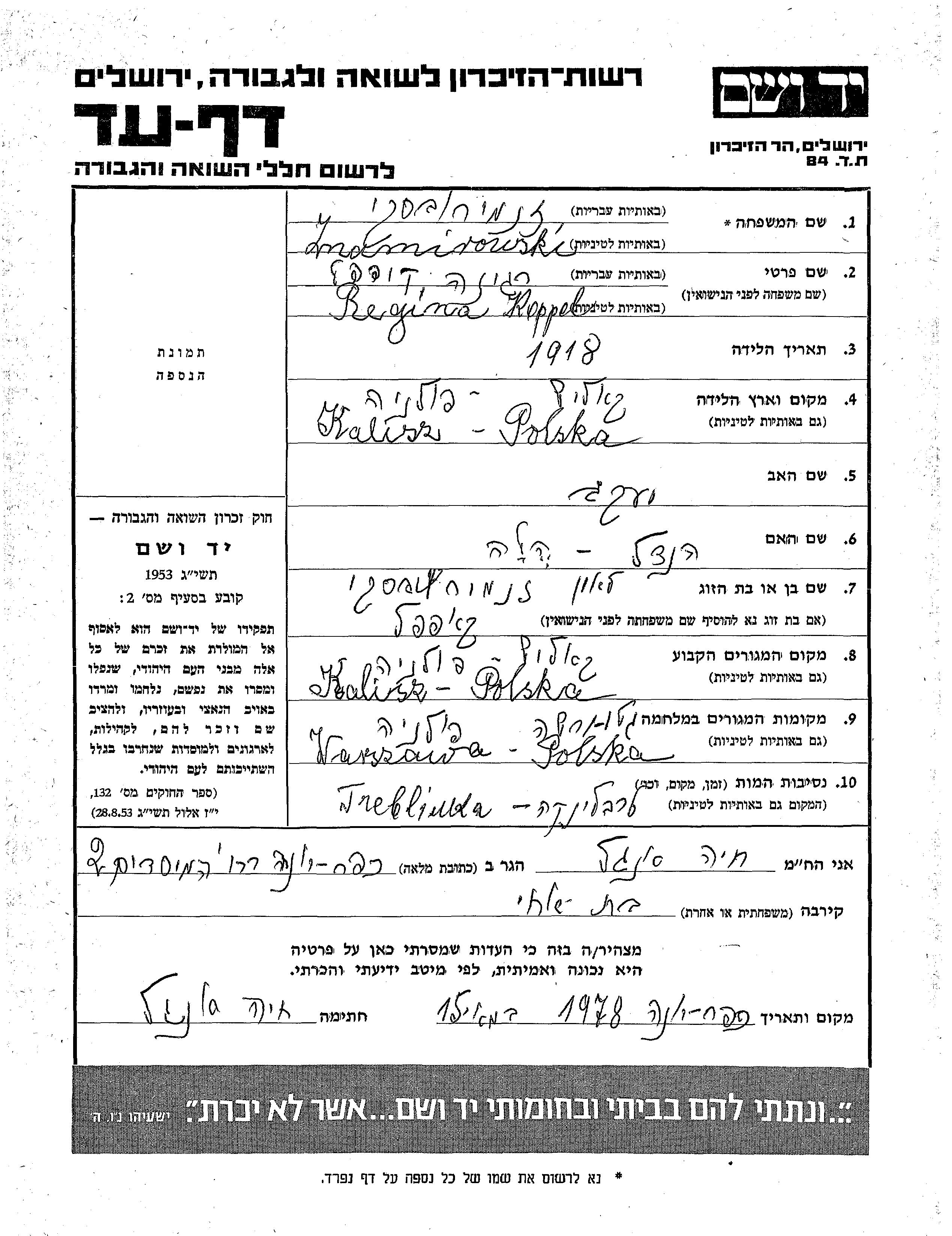 Знамировски Регина 1918 Калиш, Польша Лист свидетельских показаний